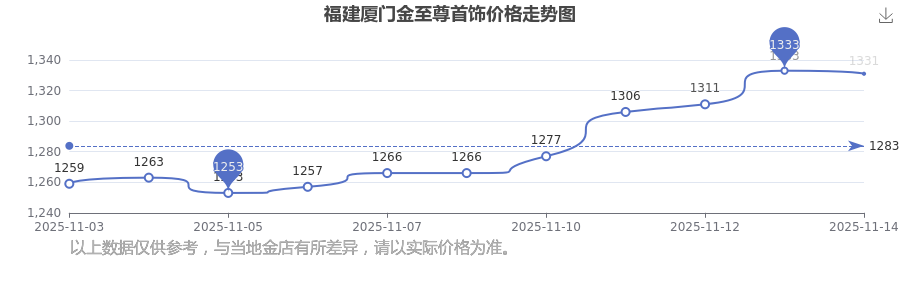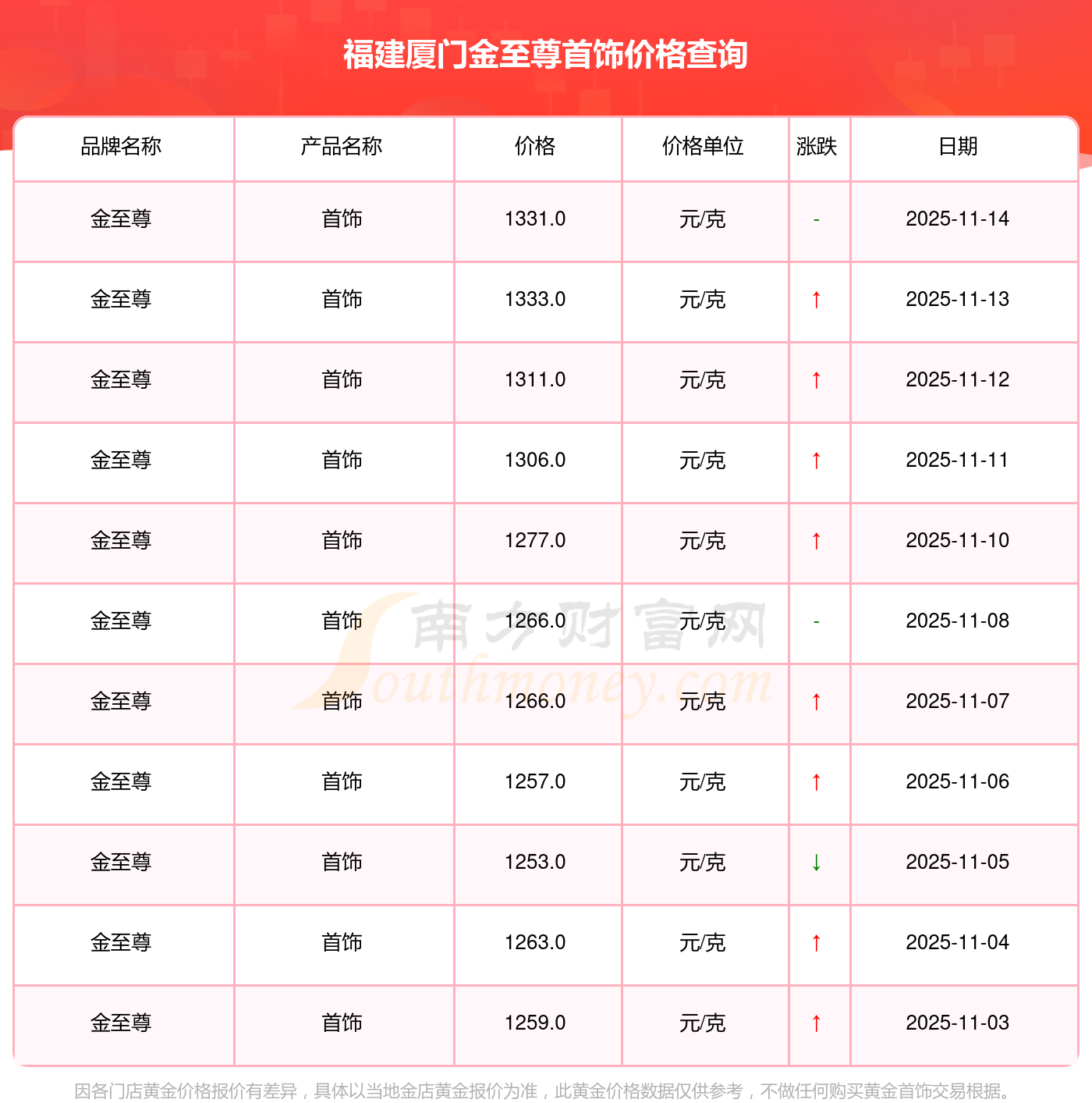 2025年11月16日福建廈門金至尊首飾價(jià)格為1331.0元/克。