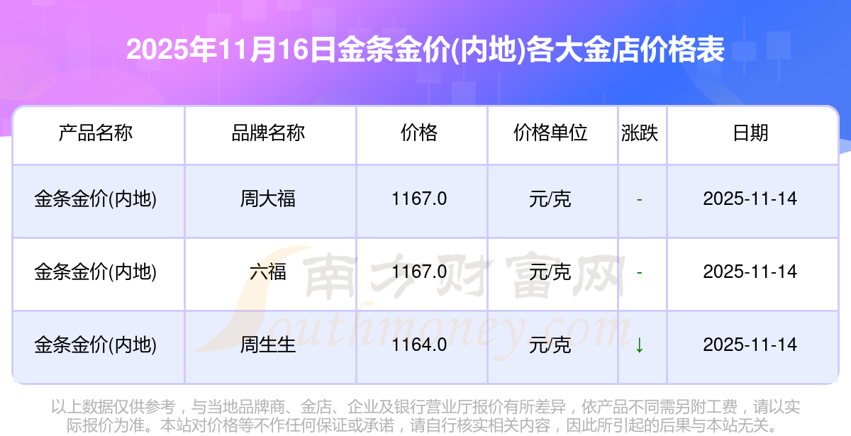 2025年11月16日,周大福、周大福、周大福、周大福、周大福、周大福、周大福、老鳳祥、老鳳祥、老鳳祥、周六福等各大金店品牌金條金價(jià)(內(nèi)地)今日價(jià)格如下:周大福1333.0元/克、周大福646.0元/克、周大福1333.0元/克、周大福46320.0、周大福18410.0、周大福41780.0、周大福1167.0元/克、老鳳祥1322.0元/克、老鳳祥600.0元/克、老鳳祥1322.0元/克、周六福1295.0元/克。