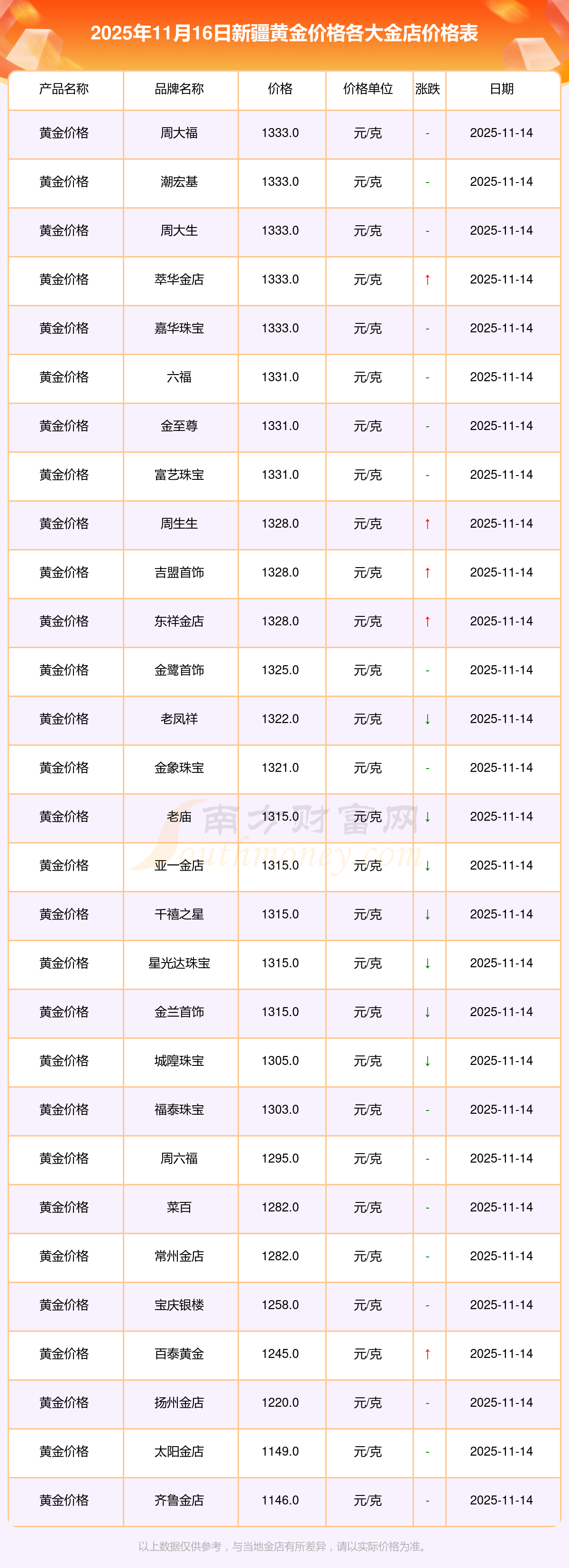2025年11月16日新疆周大福、周大福、周大福、周大福、周大福、周大福、周大福、老鳳祥、老鳳祥、老鳳祥、周六福等各大金店品牌黃金價(jià)格最新價(jià)格如下:周大福黃金價(jià)格1333.0元/克,周大福鉑金價(jià)格646.0元/克,周大福飾品金價(jià)(內(nèi)地)1333.0元/克,周大福黃金飾品(香港)46320.0,周大福鉑金價(jià)格(香港)18410.0,周大福金條價(jià)格(香港)41780.0,周大福金條金價(jià)(內(nèi)地)1167.0元/克,老鳳祥黃金價(jià)格1322.0元/克,老鳳祥鉑金價(jià)格600.0元/克,老鳳祥足金價(jià)格1322.0元/克,周六福黃金價(jià)格1295.0元/克。