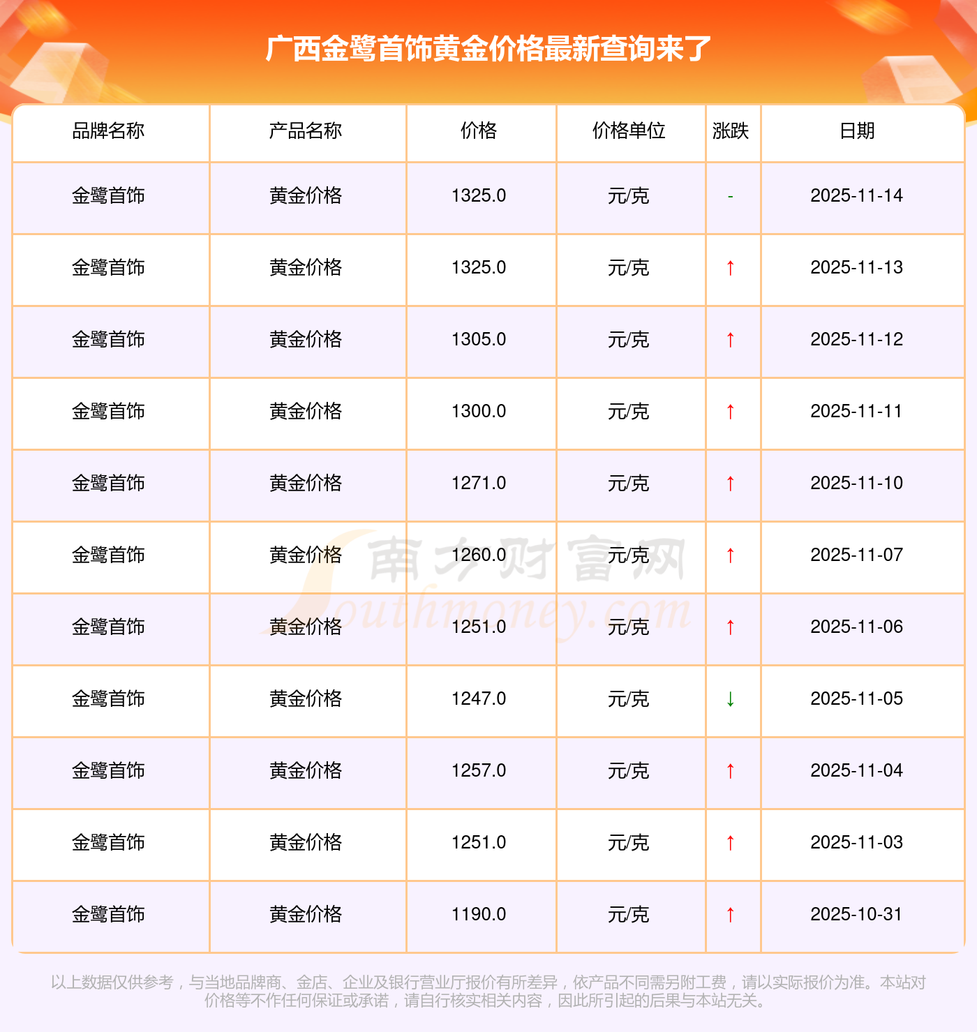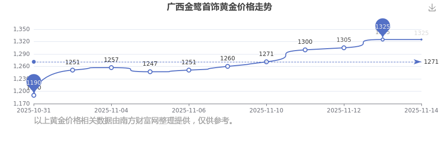 2025年11月16日,廣西金鷺首飾所售黃金價格,其價格設(shè)定為 1325.0元/克。