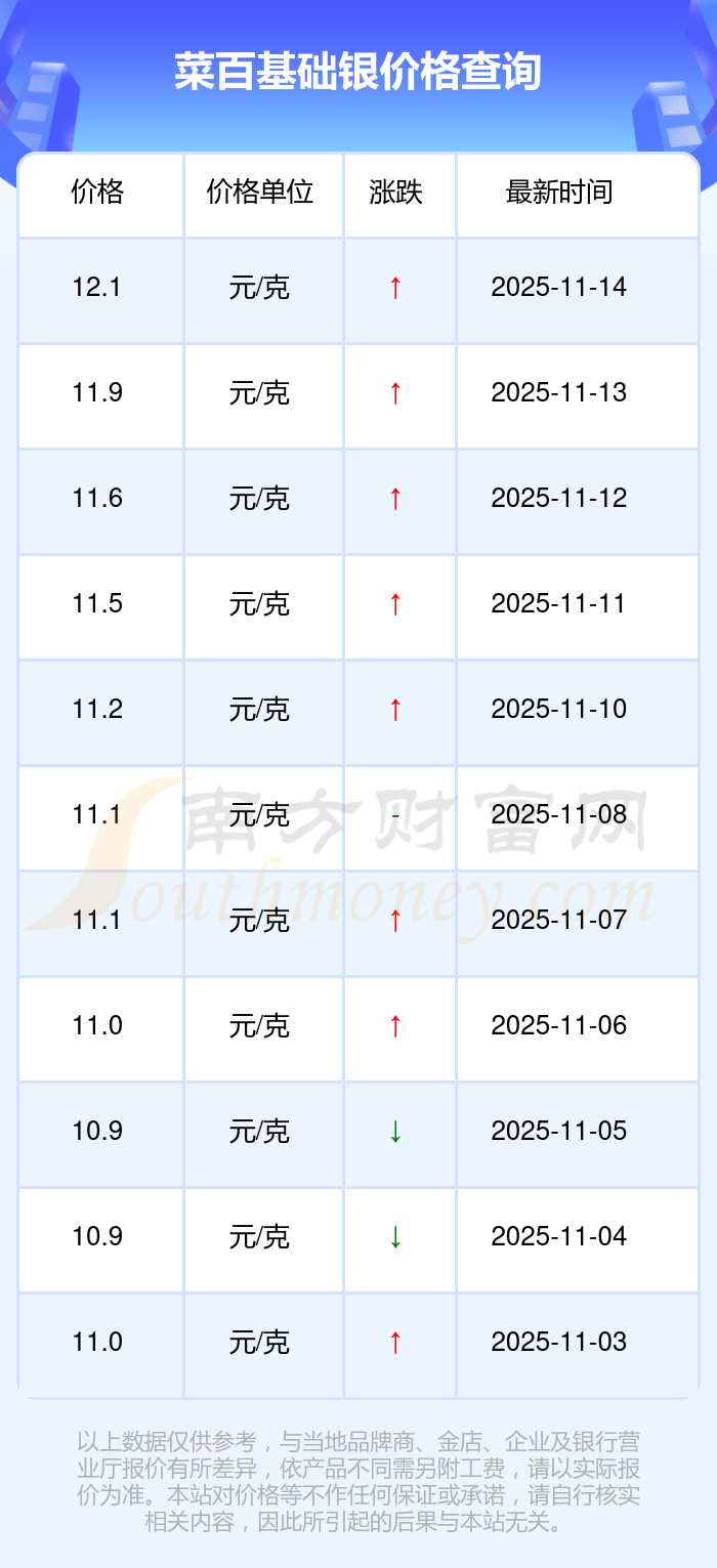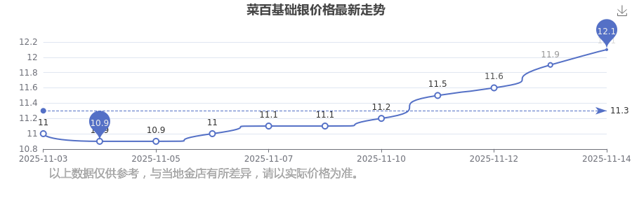 12.1元/克成為菜百今日 基礎(chǔ)銀價(jià)的最新交易的價(jià)格。