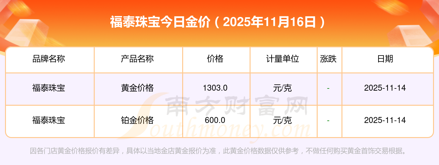 2025年11月16日福泰珠寶金價(jià)查詢:黃金價(jià)格1333.0元/克,鉑金價(jià)格646.0元/克,飾品金價(jià)(內(nèi)地)1333.0元/克,黃金飾品(香港)46320.0,鉑金價(jià)格(香港)18410.0,金條價(jià)格(香港)41780.0,金條金價(jià)(內(nèi)地)1167.0元/克,黃金價(jià)格1322.0元/克,鉑金價(jià)格600.0元/克,足金價(jià)格1322.0元/克,黃金價(jià)格1295.0元/克。