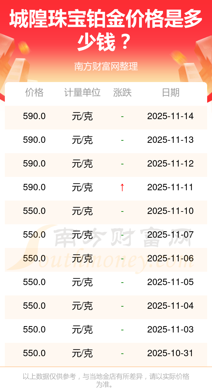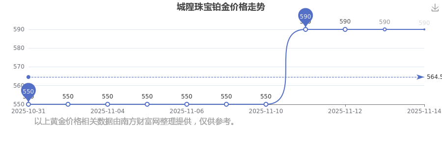 今日(2025年11月16日)城隍珠寶鉑金價格的價格為590.0元/克。