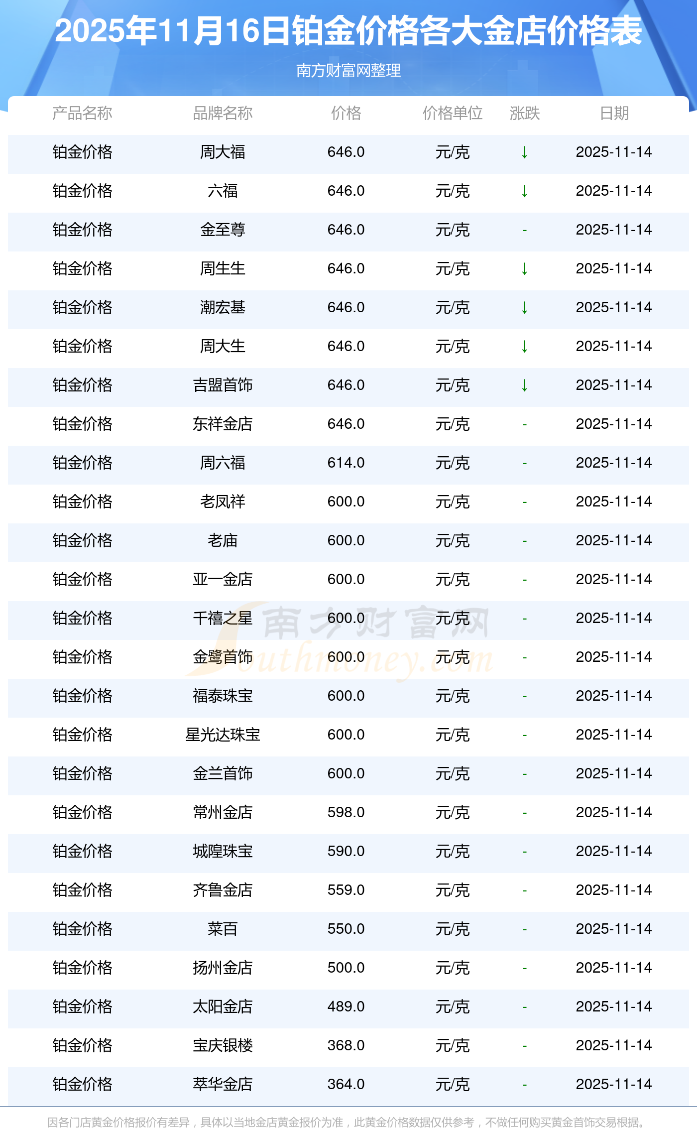 今天是2025年11月16日,周大福、周大福、周大福、周大福、周大福、周大福、周大福、老鳳祥、老鳳祥、老鳳祥、周六福等各大金店品牌鉑金價格最新價格如下:周大福1333.0元/克、周大福646.0元/克、周大福1333.0元/克、周大福46320.0、周大福18410.0、周大福41780.0、周大福1167.0元/克、老鳳祥1322.0元/克、老鳳祥600.0元/克、老鳳祥1322.0元/克、周六福1295.0元/克。