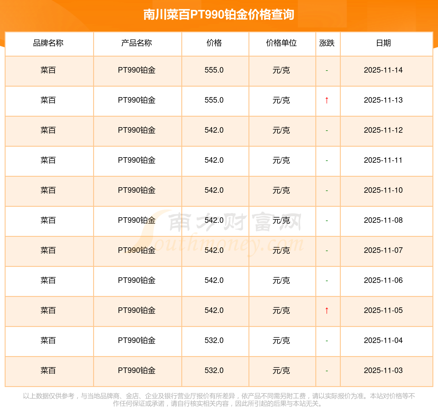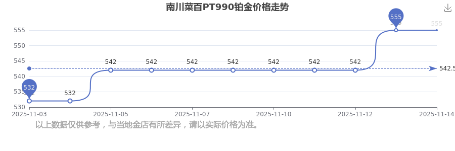 2025年11月16日當(dāng)天,南川菜百PT990鉑金的單價(jià)是 555.0元/克。