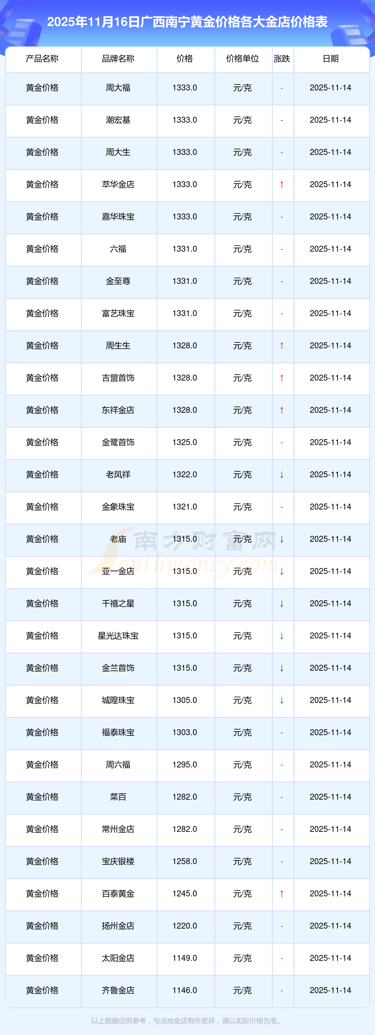2025年11月16日廣西南寧各大金店黃金價格最新價格查詢來了:周大福1333.0元/克,周大福646.0元/克,周大福1333.0元/克,周大福46320.0,周大福18410.0,周大福41780.0,周大福1167.0元/克,老鳳祥1322.0元/克,老鳳祥600.0元/克,老鳳祥1322.0元/克,周六福1295.0元/克。