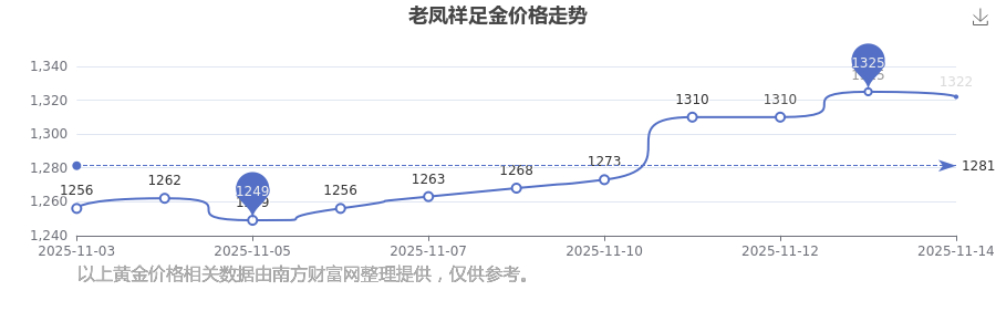2025年11月16日老鳳祥足金價格查詢:1322.0元/克。