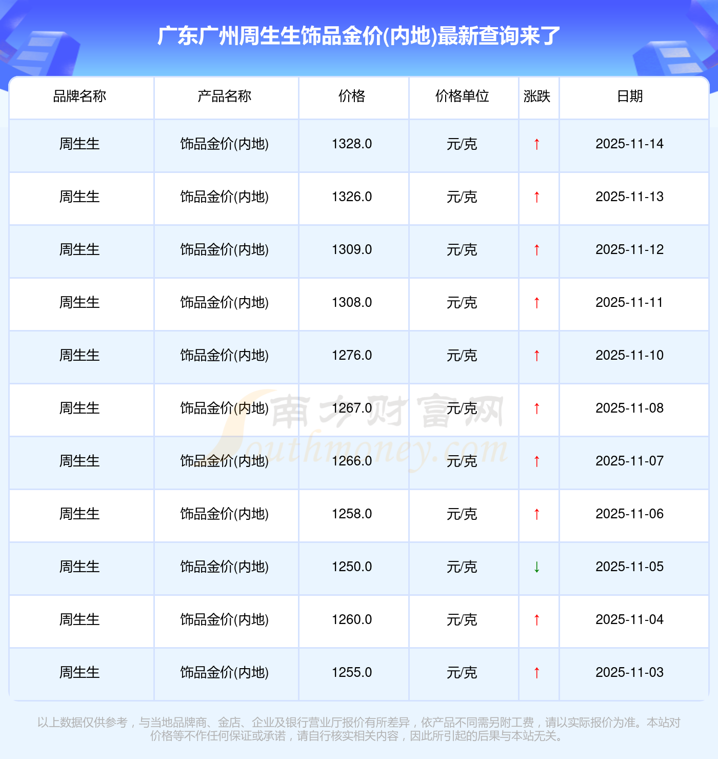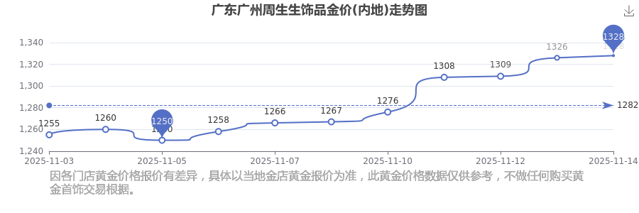 2025年11月16日,廣東廣州周生生飾品金價(內地)每克的價值量定格在1328.0元/克。