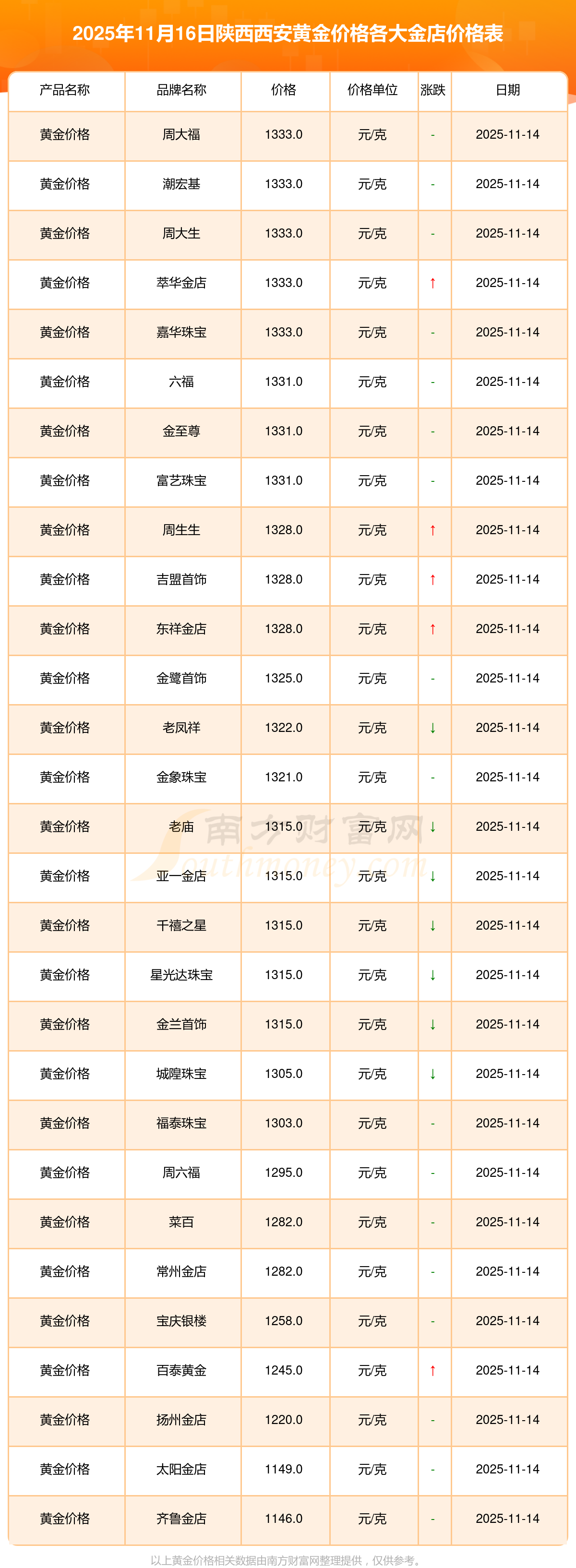 一、2025年11月16日,陜西西安周大福、周大福、周大福、周大福、周大福、周大福、周大福、老鳳祥、老鳳祥、老鳳祥、周六福等各大金店品牌黃金價(jià)格今日價(jià)格行情最新來(lái)了:周大福1333.0元/克、周大福646.0元/克、周大福1333.0元/克、周大福46320.0、周大福18410.0、周大福41780.0、周大福1167.0元/克、老鳳祥1322.0元/克、老鳳祥600.0元/克、老鳳祥1322.0元/克、周六福1295.0元/克。