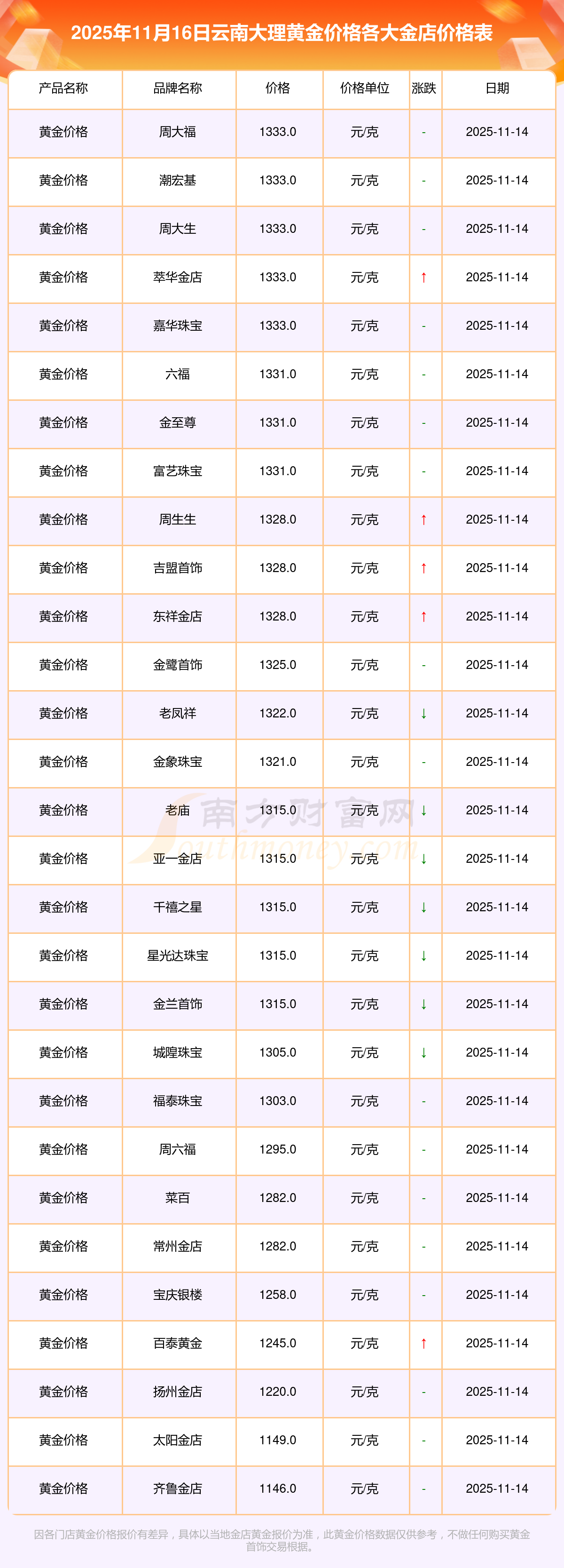 2025年11月16日云南大理周大福、周大福、周大福、周大福、周大福、周大福、周大福、老鳳祥、老鳳祥、老鳳祥、周六福等各大金店品牌黃金價格最新價格如下:周大福黃金價格1333.0元/克,周大福鉑金價格646.0元/克,周大福飾品金價(內(nèi)地)1333.0元/克,周大福黃金飾品(香港)46320.0,周大福鉑金價格(香港)18410.0,周大福金條價格(香港)41780.0,周大福金條金價(內(nèi)地)1167.0元/克,老鳳祥黃金價格1322.0元/克,老鳳祥鉑金價格600.0元/克,老鳳祥足金價格1322.0元/克,周六福黃金價格1295.0元/克。