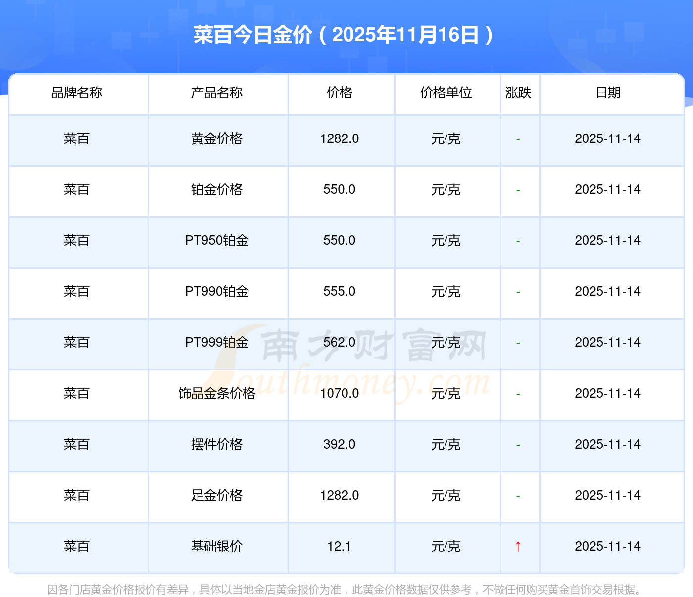 以上數(shù)據(jù)僅供參考,與當?shù)仄放粕獭⒔鸬、企業(yè)及銀行營業(yè)廳報價有所差異,依產(chǎn)品不同需另附工費,請以實際報價為準。本站對價格等不作任何保證或承諾,請自行核實相關(guān)內(nèi)容,因此所引起的后果與本站無關(guān)。