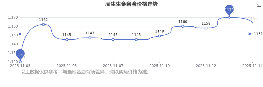 今日(2025年11月16日)周生生金條金價(jià)的價(jià)格為1164.0元/克。