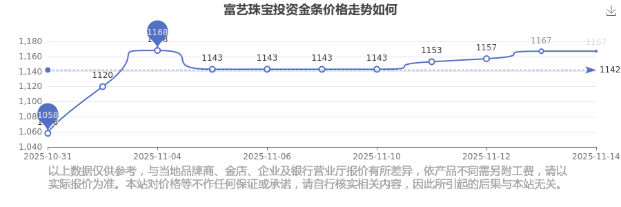 今日富藝珠寶 投資金條的最新定價(jià)為1167.0元/克。