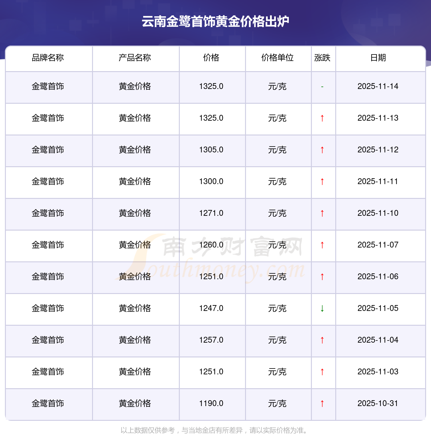 因各門店黃金價格報價有差異,具體以當(dāng)?shù)亟鸬挈S金報價為準(zhǔn),此黃金價格數(shù)據(jù)僅供參考,不做任何購買黃金首飾交易根據(jù)。