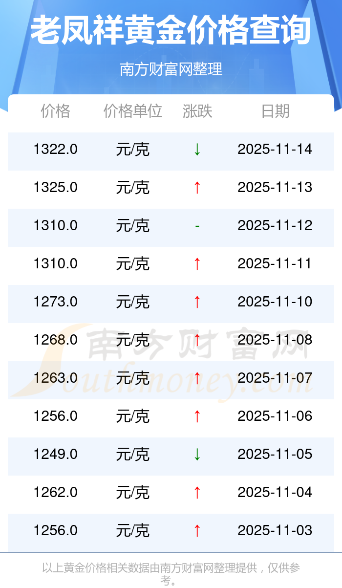 今日黃金價格查詢_現(xiàn)在金價黃金一克多少錢,黃金價格是多少錢一克?是優(yōu)良導(dǎo)電導(dǎo)熱材料的黃金,有良好的導(dǎo)熱特性。電子工業(yè)的特殊電路設(shè)計常采用它,因其化學(xué)穩(wěn)定性高、抗氧化性強(qiáng),能夠制作高精度電子元件。1322.0元/克的價格,是老鳳祥今日 黃金價格的最新行情。