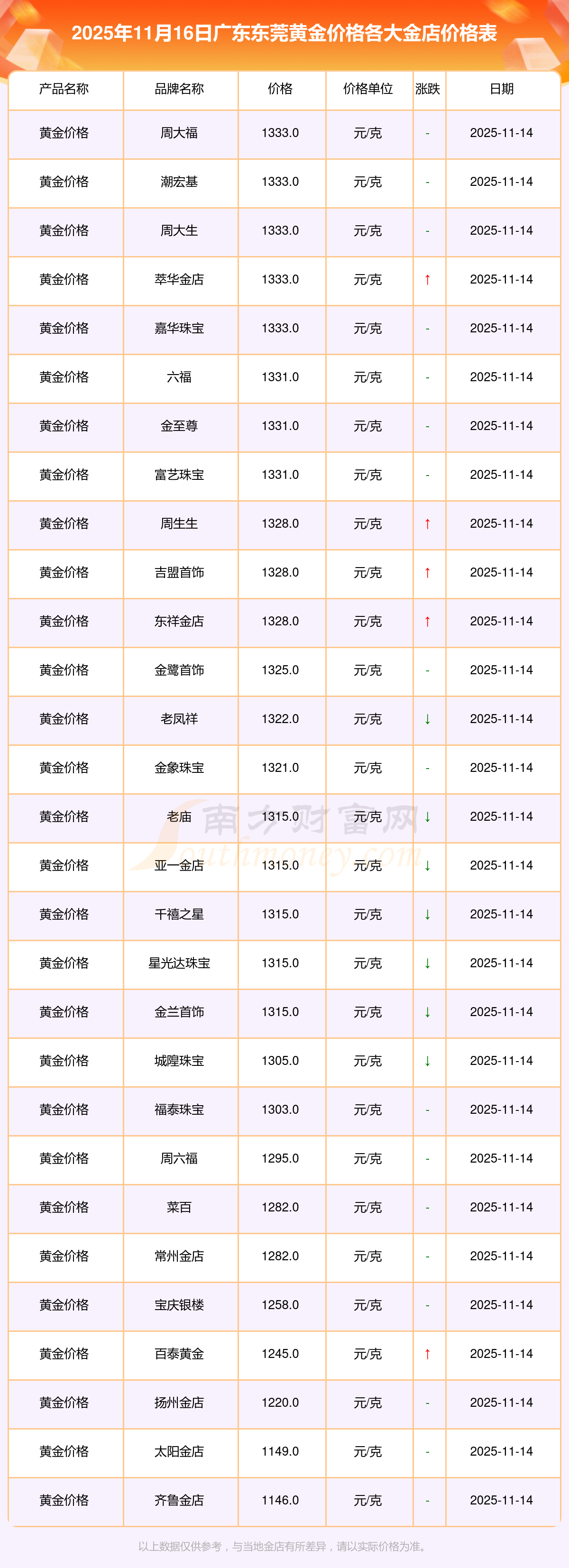 2025年11月16日廣東東莞各大金店黃金價(jià)格最新價(jià)格:周大福1333.0元/克,周大福646.0元/克,周大福1333.0元/克,周大福46320.0,周大福18410.0,周大福41780.0,周大福1167.0元/克,老鳳祥1322.0元/克,老鳳祥600.0元/克,老鳳祥1322.0元/克,周六福1295.0元/克。