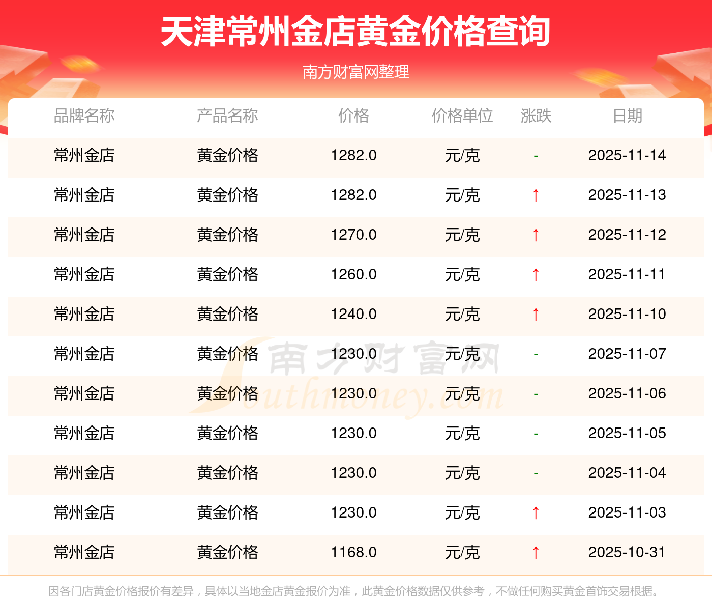 今日(2025年11月16日),天津常州金店黃金價(jià)格每克的價(jià)值為1282.0元/克。