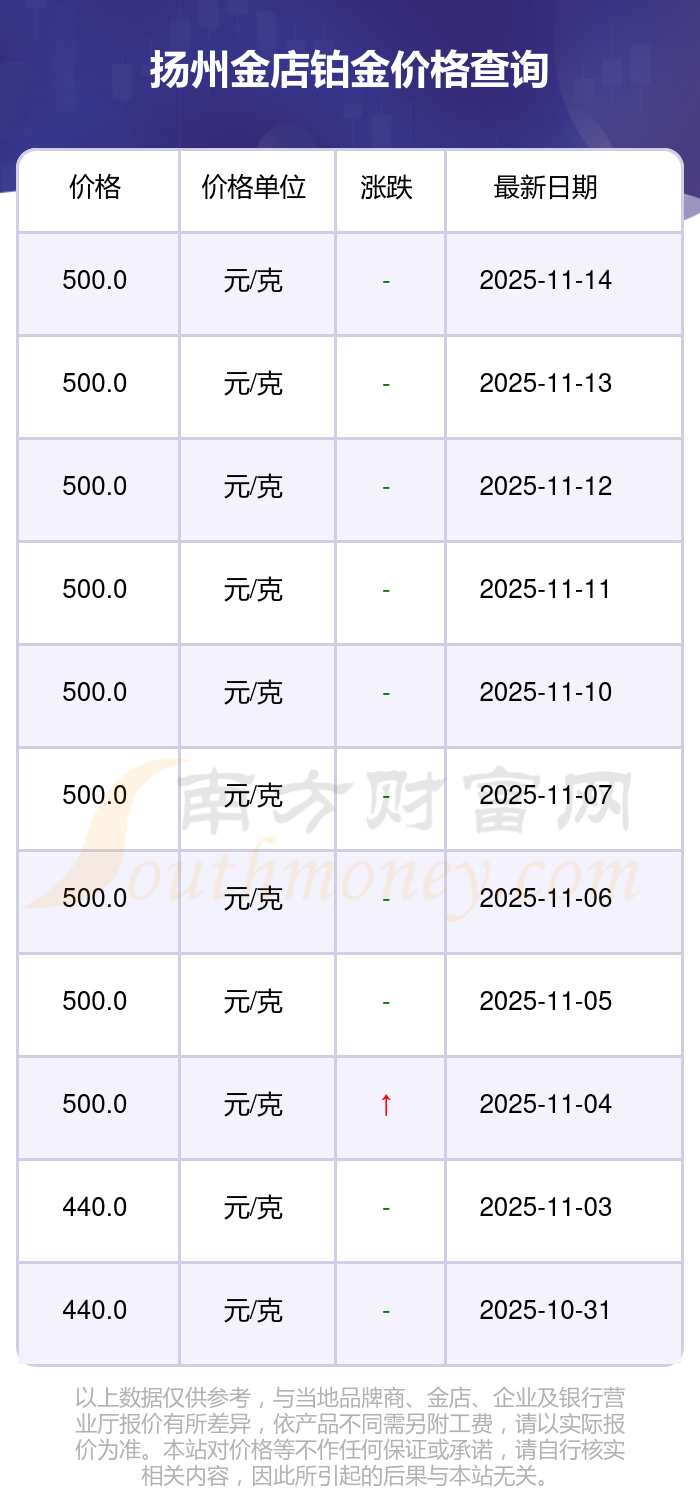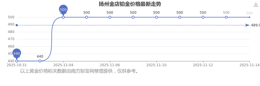 今日(2025年11月16日),揚州金店鉑金價格:500.0元/克。