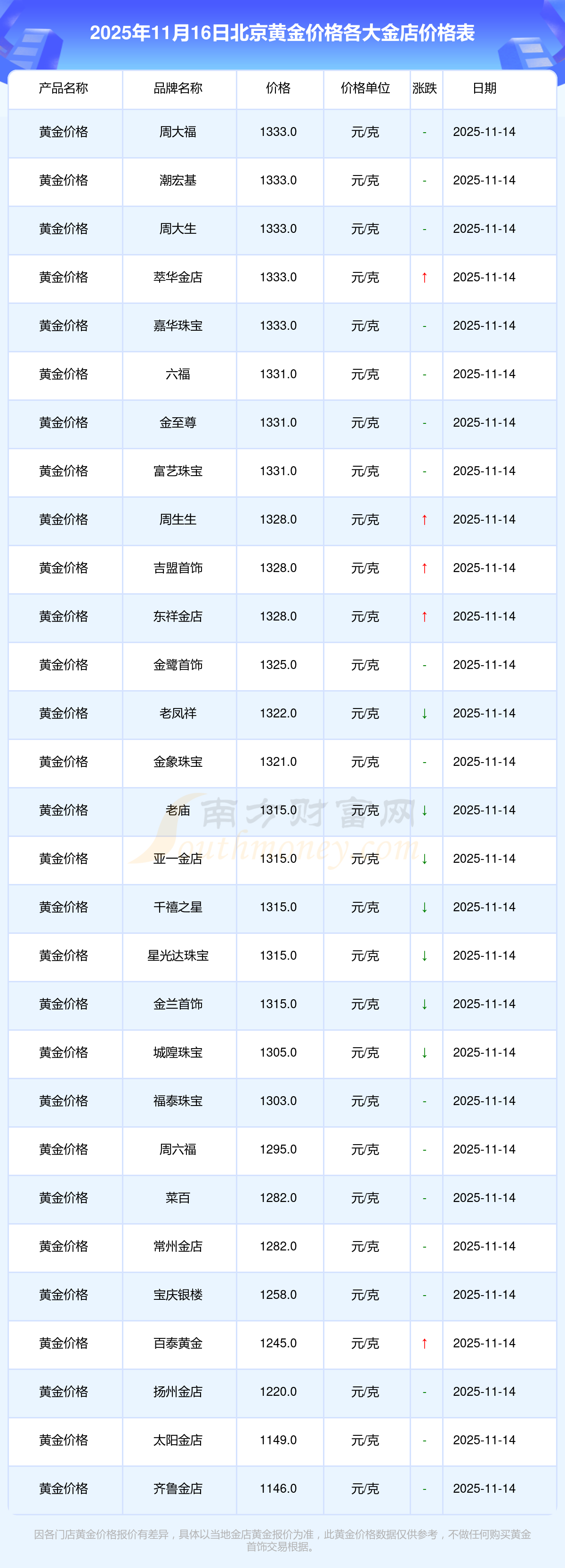 2025年11月16日北京周大福、周大福、周大福、周大福、周大福、周大福、周大福、老鳳祥、老鳳祥、老鳳祥、周六福等各大金店品牌黃金價格最新價格如下:周大福黃金價格1333.0元/克,周大福鉑金價格646.0元/克,周大福飾品金價(內(nèi)地)1333.0元/克,周大福黃金飾品(香港)46320.0,周大福鉑金價格(香港)18410.0,周大福金條價格(香港)41780.0,周大福金條金價(內(nèi)地)1167.0元/克,老鳳祥黃金價格1322.0元/克,老鳳祥鉑金價格600.0元/克,老鳳祥足金價格1322.0元/克,周六福黃金價格1295.0元/克。