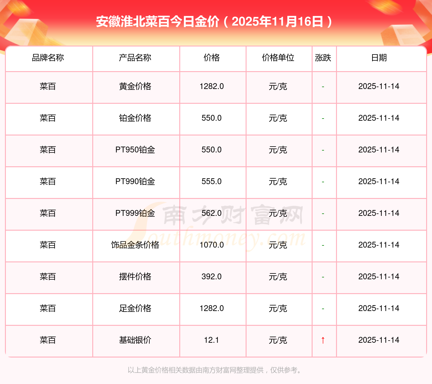 想查詢今天黃金價格,此刻黃金一克的價格是多少呀? 2025年11月16日安徽淮北菜百現(xiàn)在購買一克黃金需要支付多少錢?黃金價格1333.0元/克,鉑金價格646.0元/克,飾品金價(內(nèi)地)1333.0元/克,黃金飾品(香港)46320.0,鉑金價格(香港)18410.0,金條價格(香港)41780.0,金條金價(內(nèi)地)1167.0元/克,黃金價格1322.0元/克,鉑金價格600.0元/克,足金價格1322.0元/克,黃金價格1295.0元/克。