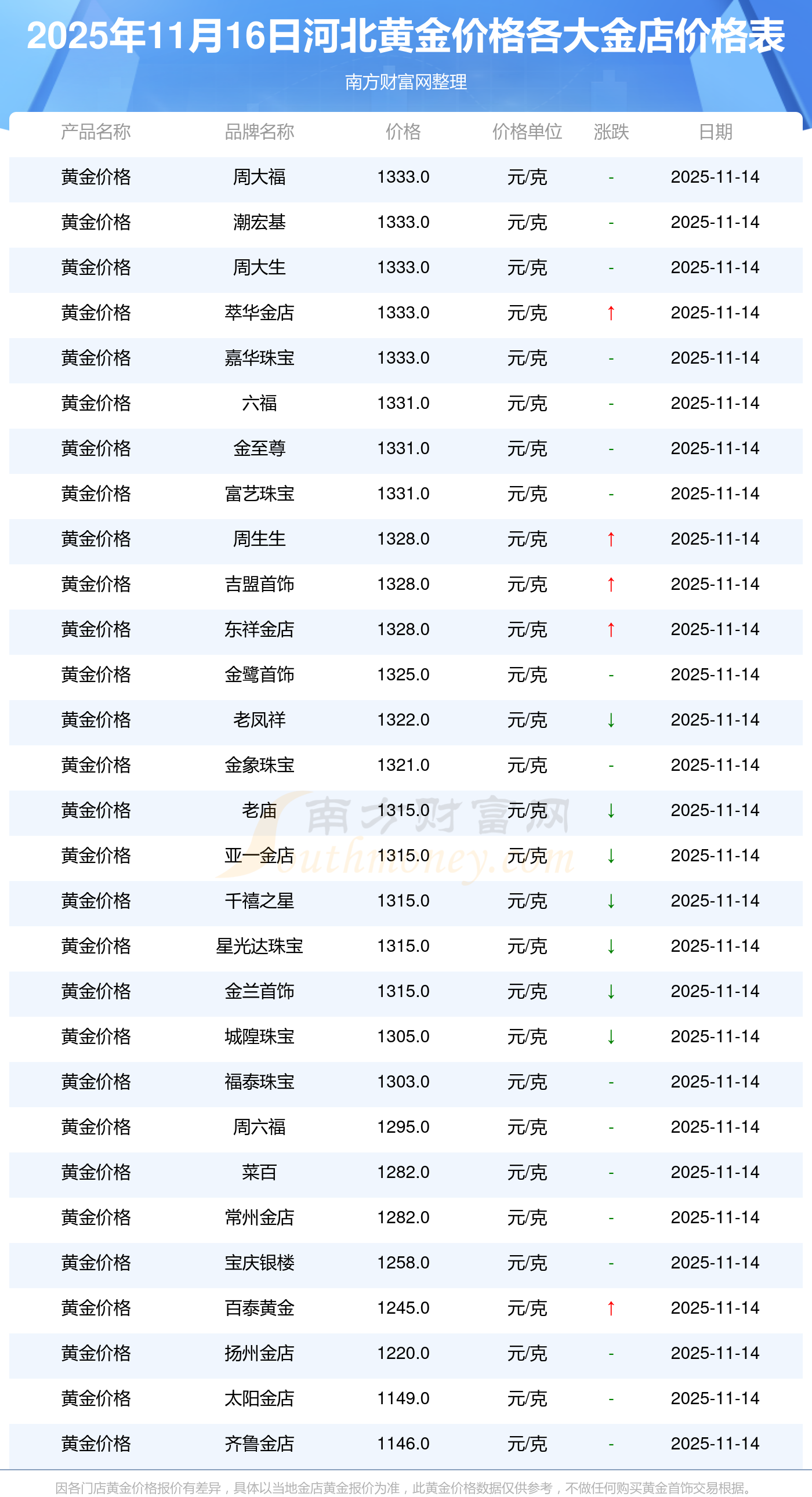 2025年11月16日,河北周大福、周大福、周大福、周大福、周大福、周大福、周大福、老鳳祥、老鳳祥、老鳳祥、周六福等各大金店品牌黃金價格今日價格行情最新來了:周大福1333.0元/克、周大福646.0元/克、周大福1333.0元/克、周大福46320.0、周大福18410.0、周大福41780.0、周大福1167.0元/克、老鳳祥1322.0元/克、老鳳祥600.0元/克、老鳳祥1322.0元/克、周六福1295.0元/克。