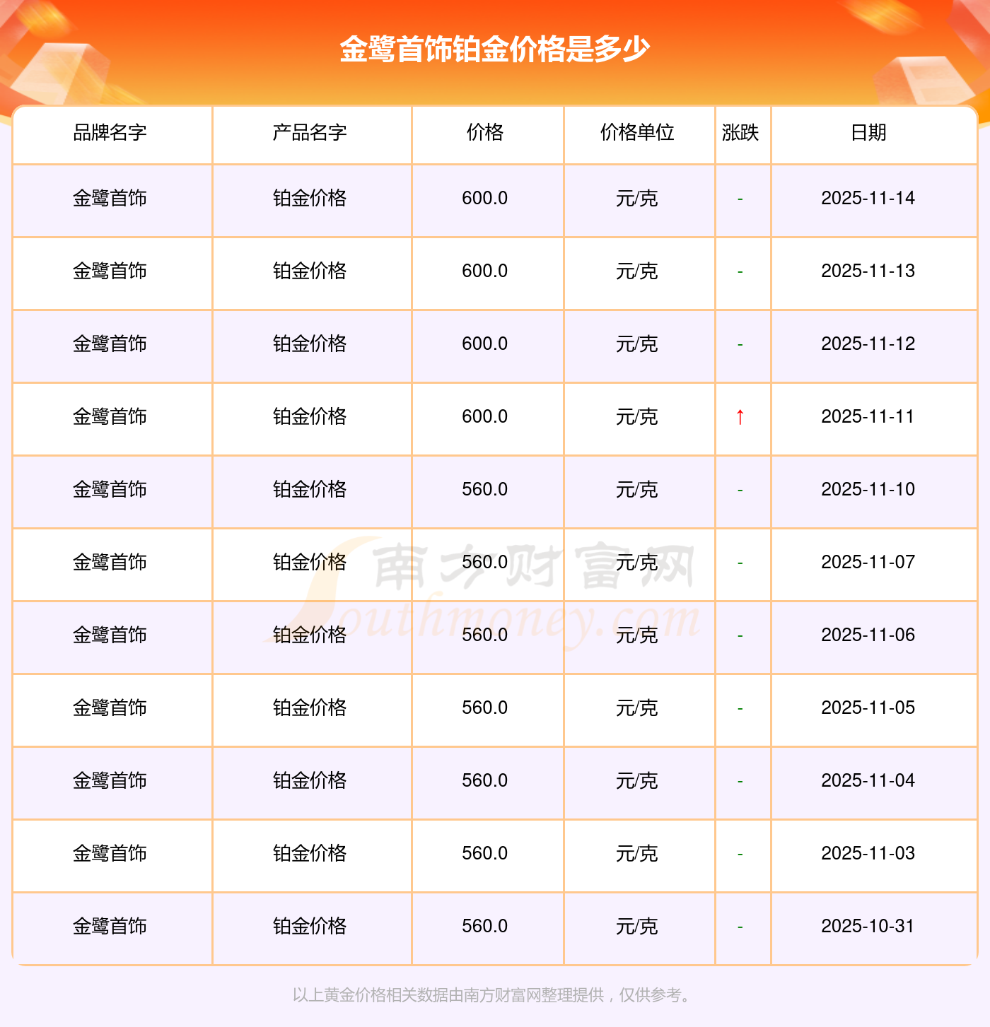 今日金鷺首飾鉑金價(jià)格最新價(jià)格為600.0元/克。