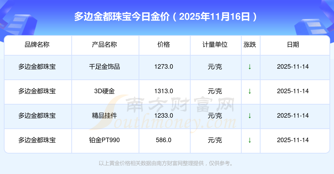 現(xiàn)在多邊金都珠寶黃金價格是多少錢1克_2025年多邊金都珠寶今日金價是多少錢一克,最新多邊金都珠寶查詢,2025年11月16日多邊金都珠寶千足金飾品現(xiàn)在每克多少錢?最新多邊金都珠寶千足金飾品報價公布,一起來看看吧!