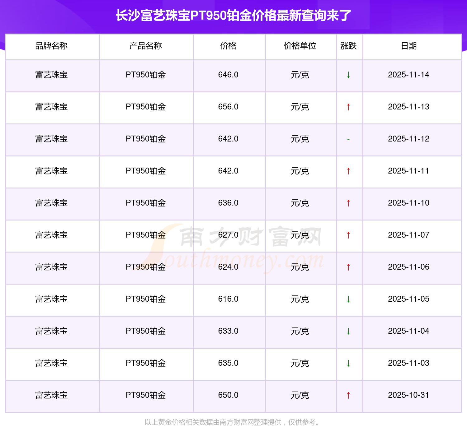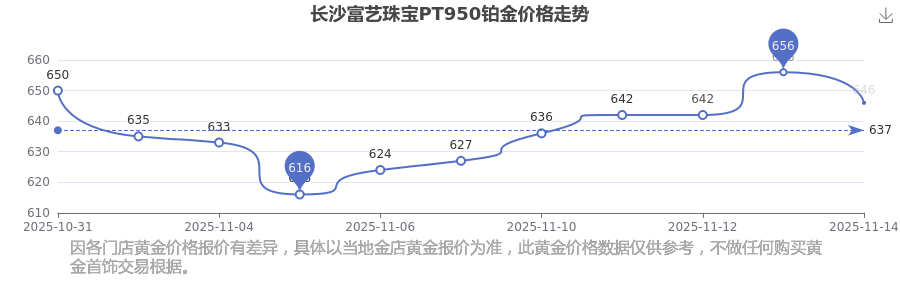 646.0元/克的PT950鉑金價(jià)格,是長(zhǎng)沙富藝珠寶在 2025年11月16日給出的。