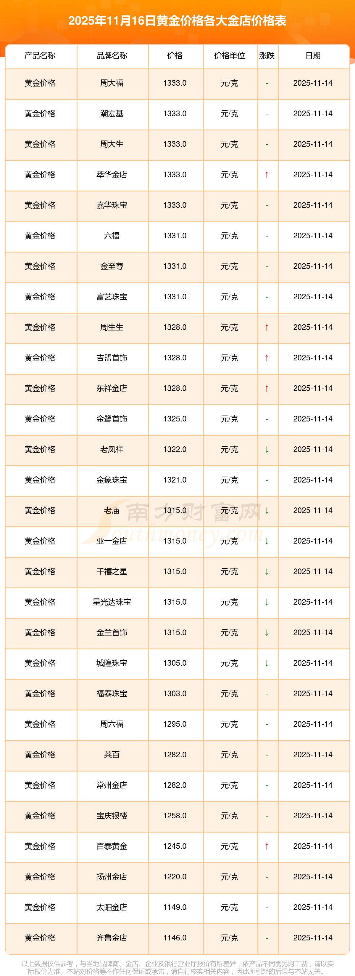 2025年11月16日,周大福、周大福、周大福、周大福、周大福、周大福、周大福、老鳳祥、老鳳祥、老鳳祥、周六福等各大金店品牌黃金價格今日價格如下:周大福1333.0元/克、周大福646.0元/克、周大福1333.0元/克、周大福46320.0、周大福18410.0、周大福41780.0、周大福1167.0元/克、老鳳祥1322.0元/克、老鳳祥600.0元/克、老鳳祥1322.0元/克、周六福1295.0元/克。