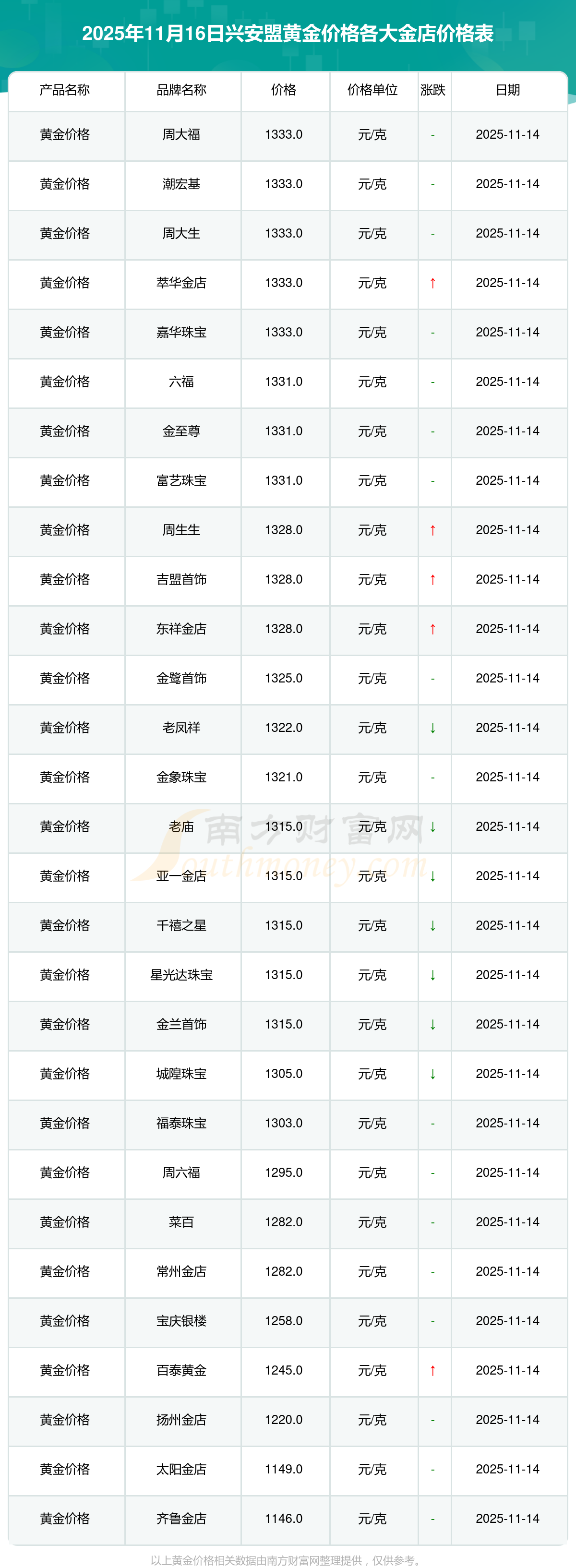 2025年11月16日興安盟周大福、周大福、周大福、周大福、周大福、周大福、周大福、老鳳祥、老鳳祥、老鳳祥、周六福等各大金店品牌黃金價(jià)格最新價(jià)格行情來(lái)了,如下:周大福黃金價(jià)格1333.0元/克,周大福鉑金價(jià)格646.0元/克,周大福飾品金價(jià)(內(nèi)地)1333.0元/克,周大福黃金飾品(香港)46320.0,周大福鉑金價(jià)格(香港)18410.0,周大福金條價(jià)格(香港)41780.0,周大福金條金價(jià)(內(nèi)地)1167.0元/克,老鳳祥黃金價(jià)格1322.0元/克,老鳳祥鉑金價(jià)格600.0元/克,老鳳祥足金價(jià)格1322.0元/克,周六福黃金價(jià)格1295.0元/克。