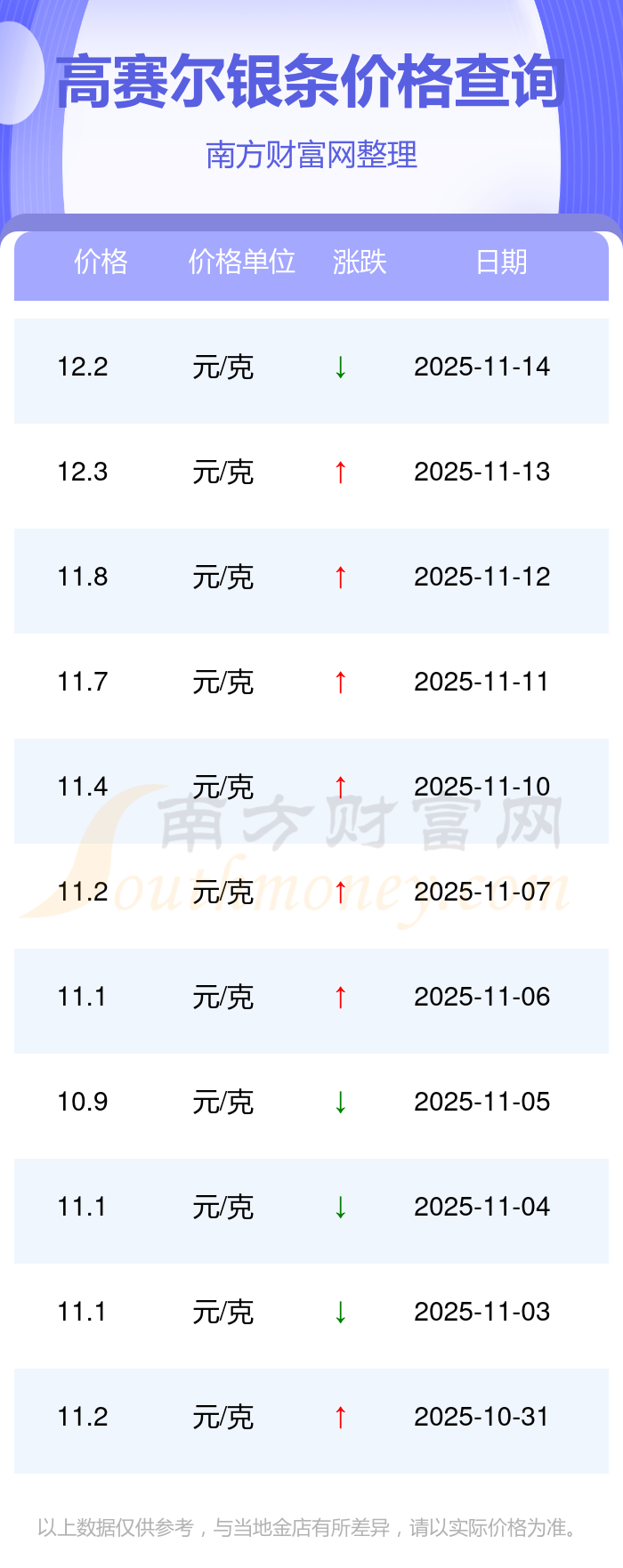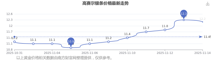 今日(2025年11月16日),高賽爾銀條最新價(jià)格是12.2元/克。
