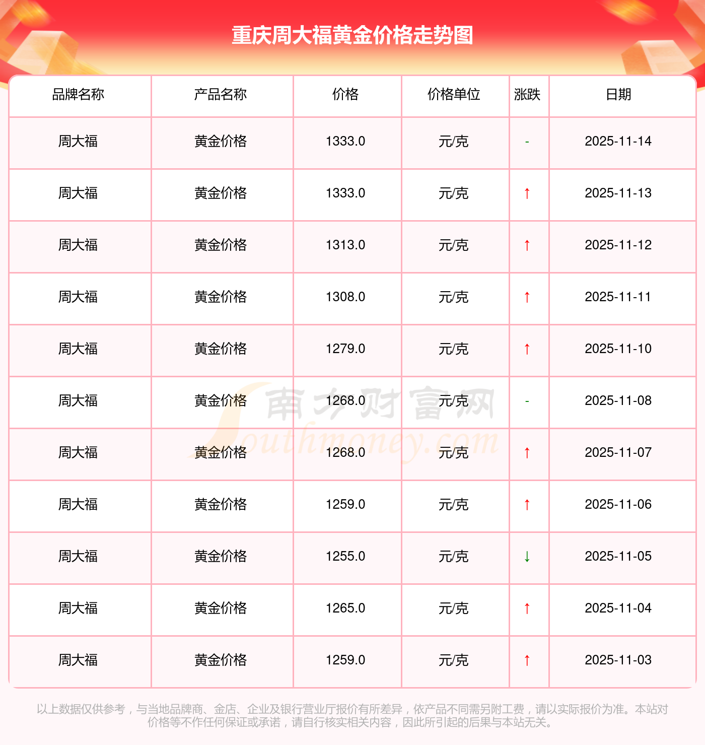 今日(2025年11月16日)重慶周大福黃金價(jià)格是1333.0元/克。
