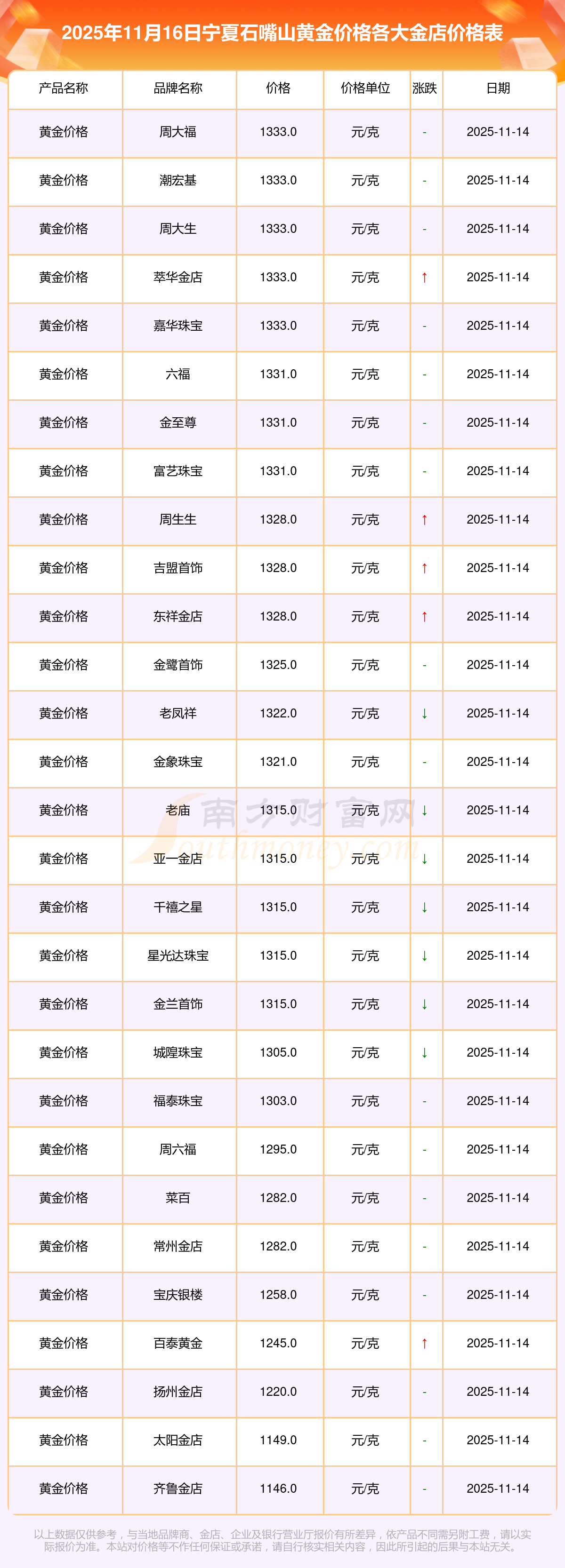 今天是2025年11月16日,寧夏石嘴山周大福、周大福、周大福、周大福、周大福、周大福、周大福、老鳳祥、老鳳祥、老鳳祥、周六福等各大金店品牌黃金價(jià)格最新價(jià)格如下:周大福1333.0元/克、周大福646.0元/克、周大福1333.0元/克、周大福46320.0、周大福18410.0、周大福41780.0、周大福1167.0元/克、老鳳祥1322.0元/克、老鳳祥600.0元/克、老鳳祥1322.0元/克、周六福1295.0元/克。