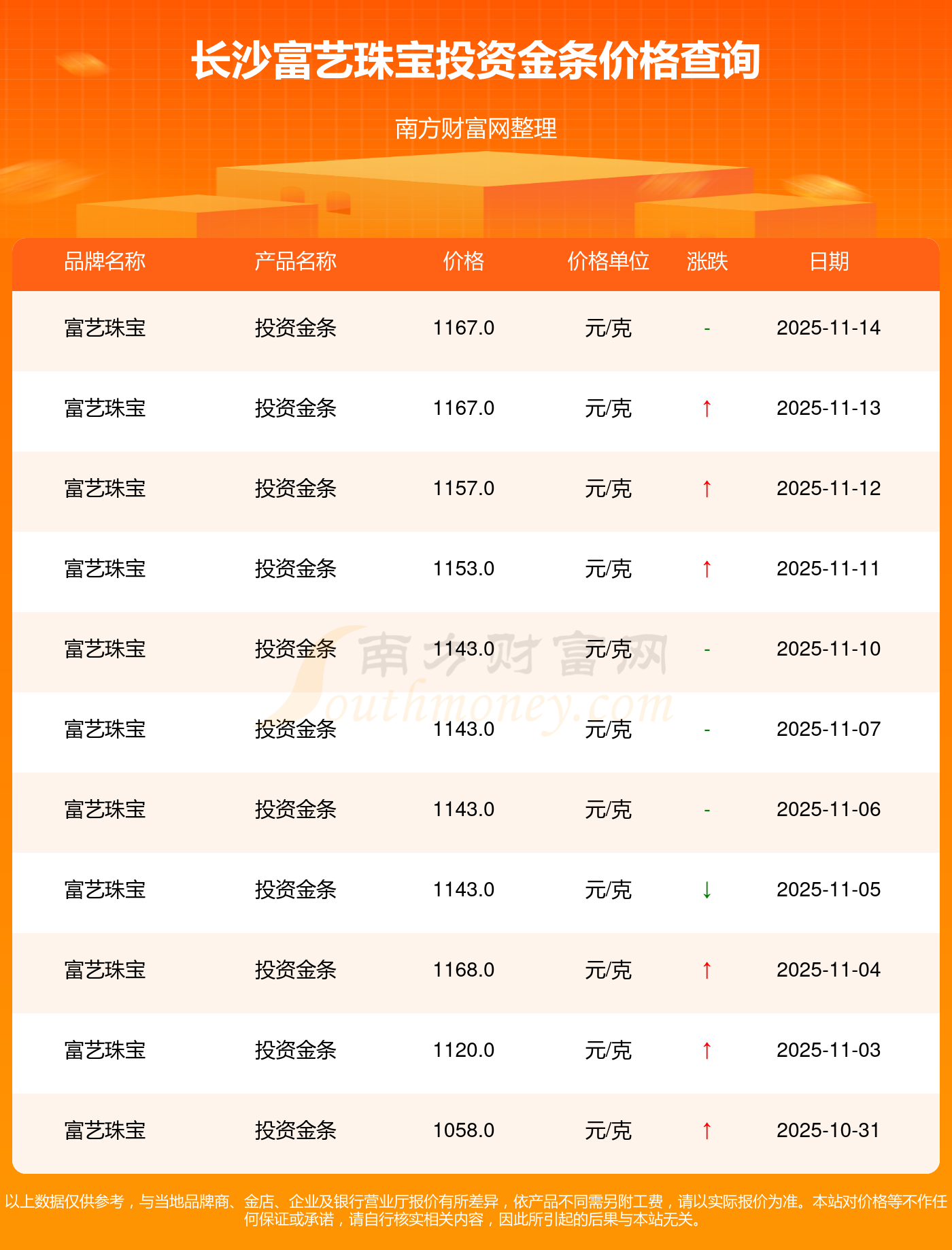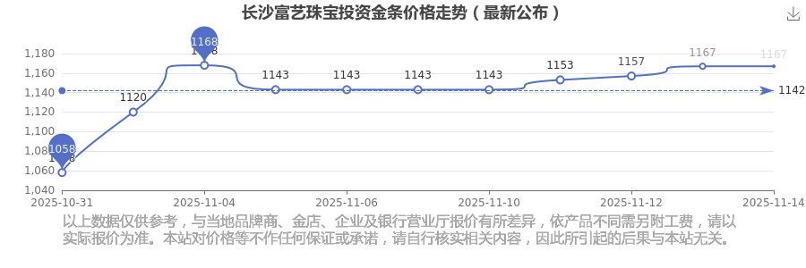 1167.0元/克,此乃長(zhǎng)沙富藝珠寶于 2025年11月16日投資金條的掛牌價(jià)格。
