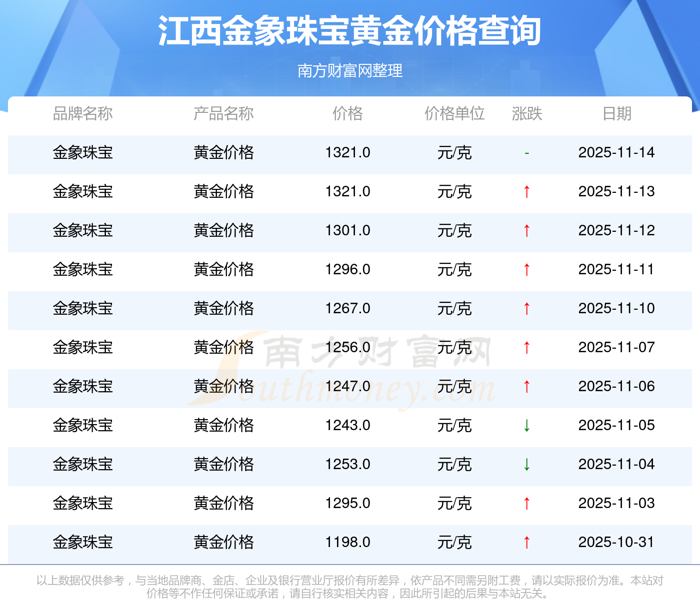 今日(2025年11月16日),江西金象珠寶黃金價(jià)格的定價(jià)為 1321.0元/克。