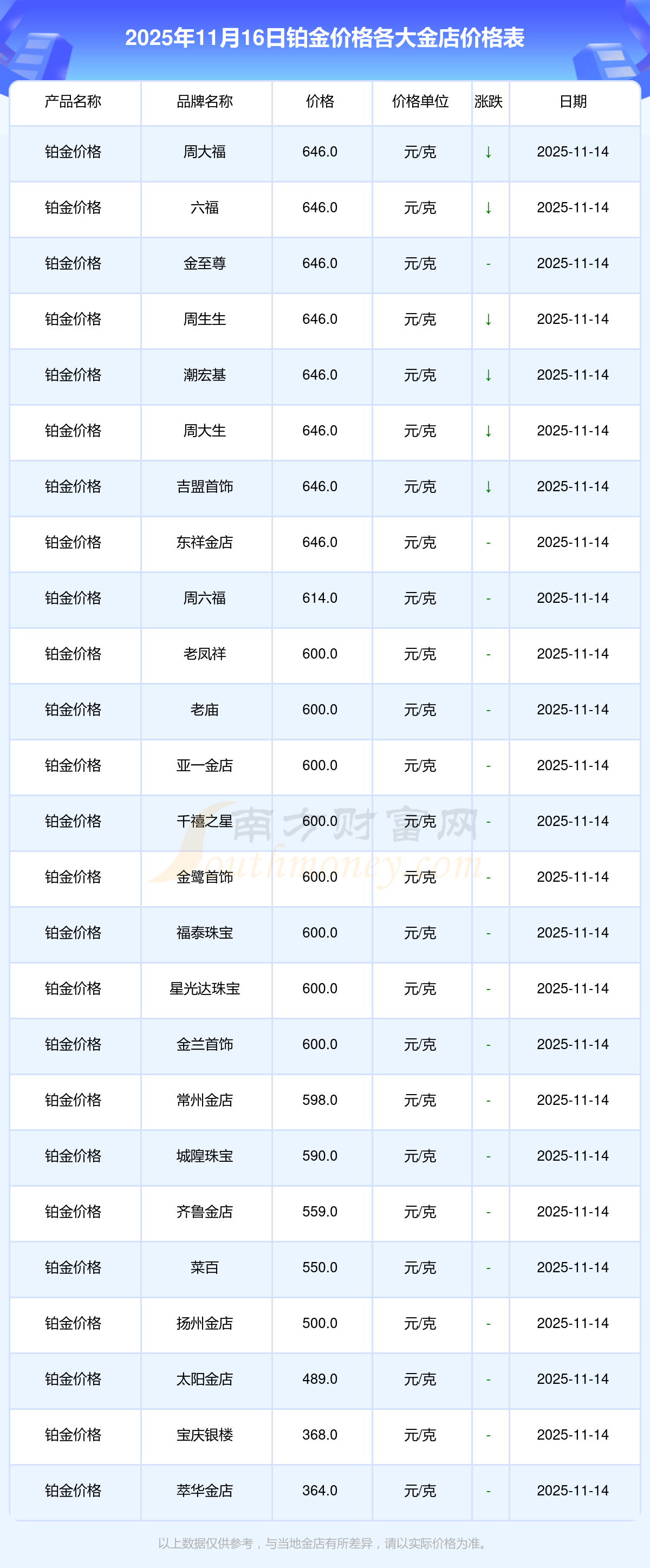 今天是2025年11月16日,周大福、周大福、周大福、周大福、周大福、周大福、周大福、老鳳祥、老鳳祥、老鳳祥、周六福等各大金店品牌鉑金價格最新價格如下:周大福1333.0元/克、周大福646.0元/克、周大福1333.0元/克、周大福46320.0、周大福18410.0、周大福41780.0、周大福1167.0元/克、老鳳祥1322.0元/克、老鳳祥600.0元/克、老鳳祥1322.0元/克、周六福1295.0元/克。