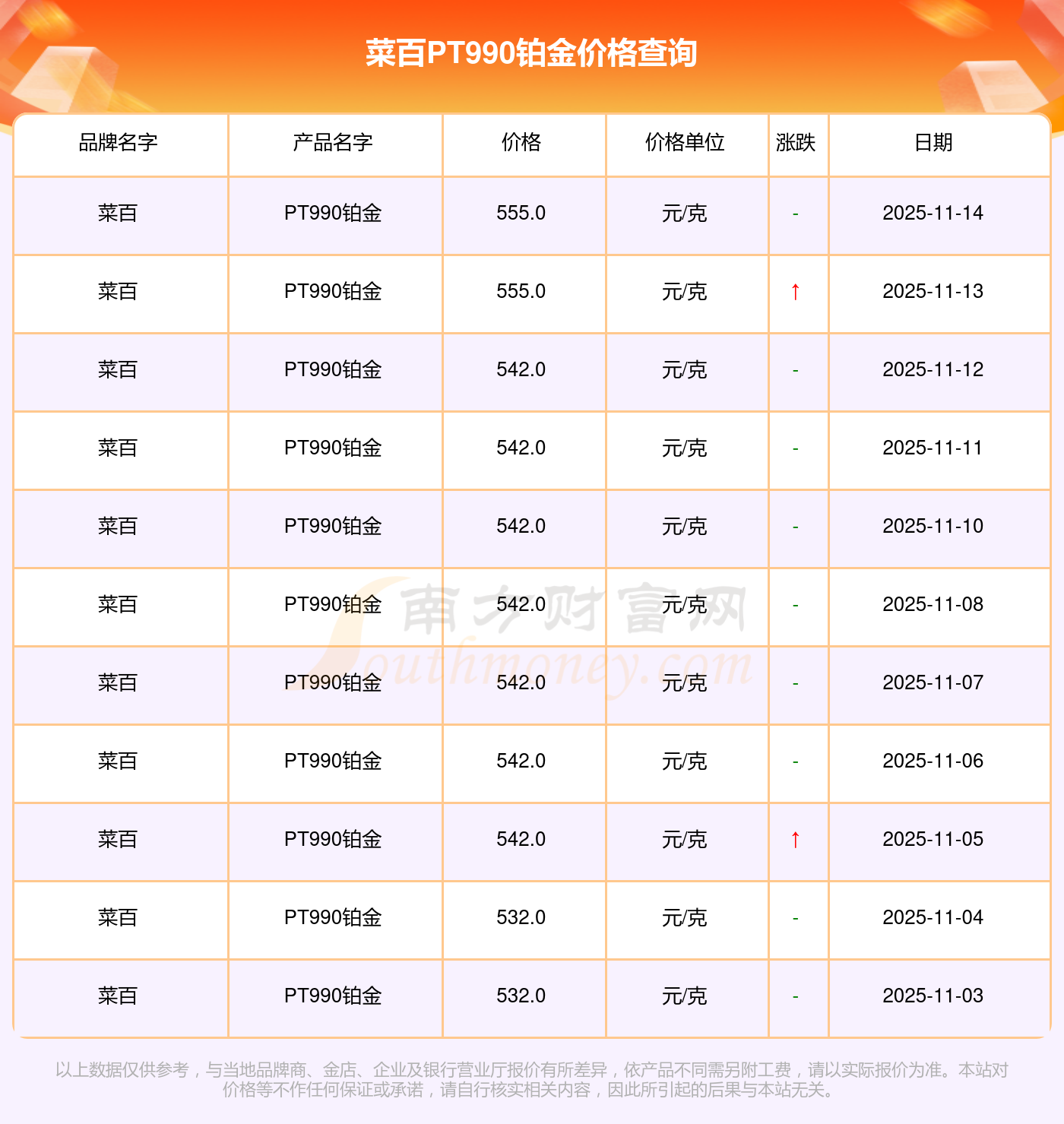 菜百 PT990鉑金在今日的最新價(jià)格顯示為555.0元/克。