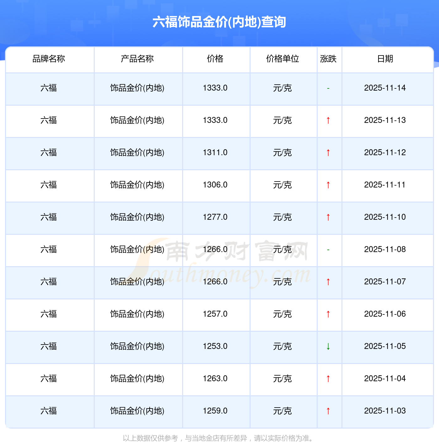 最新數(shù)據(jù)表明,六福今日 飾品金價(內地)為1333.0元/克。