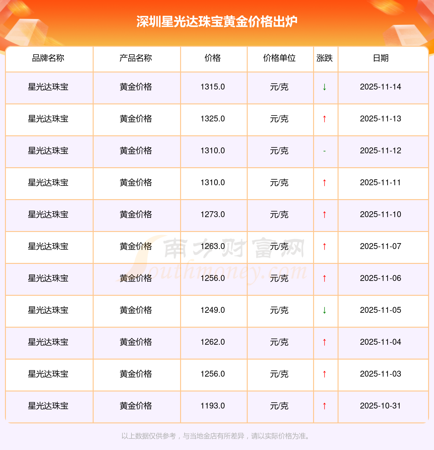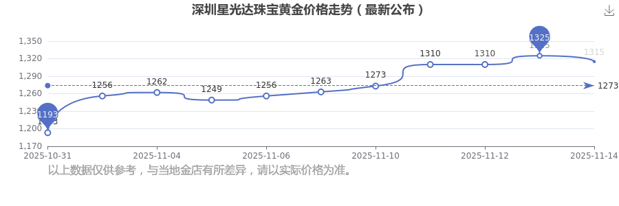 2025年11月16日,今日深圳星光達珠寶黃金價格:1315.0元/克。