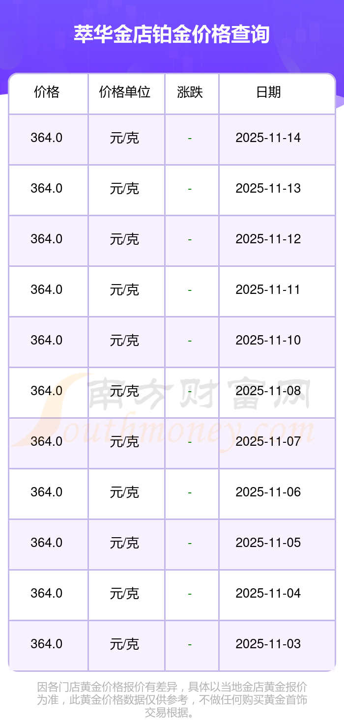 萃華金店 鉑金價(jià)格于今日的最新掛牌價(jià)為364.0元/克。