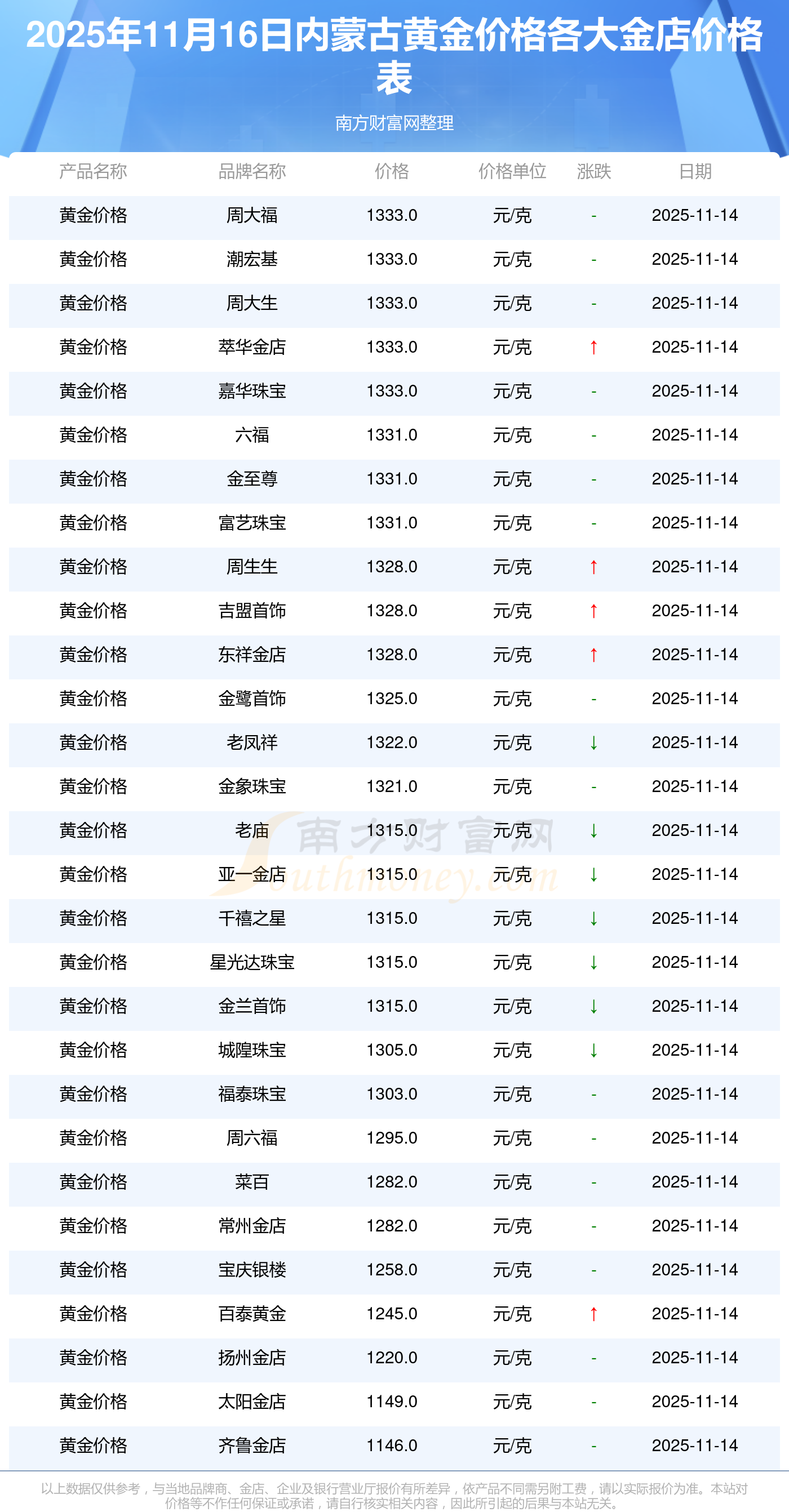 2025年11月16日內(nèi)蒙古各大金店黃金價(jià)格最新價(jià)格:周大福1333.0元/克,周大福646.0元/克,周大福1333.0元/克,周大福46320.0,周大福18410.0,周大福41780.0,周大福1167.0元/克,老鳳祥1322.0元/克,老鳳祥600.0元/克,老鳳祥1322.0元/克,周六福1295.0元/克。
