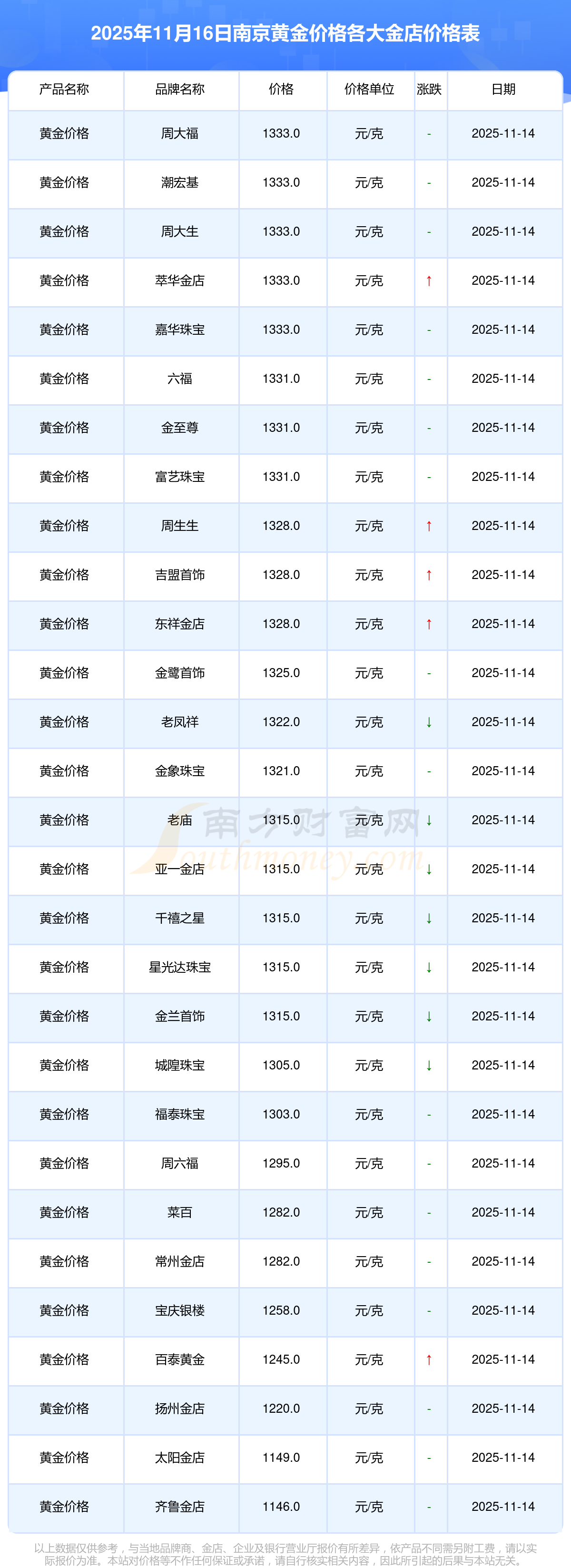 2025年11月16日南京周大福、周大福、周大福、周大福、周大福、周大福、周大福、老鳳祥、老鳳祥、老鳳祥、周六福等各大金店品牌黃金價格最新價格如下:周大福黃金價格1333.0元/克,周大福鉑金價格646.0元/克,周大福飾品金價(內(nèi)地)1333.0元/克,周大福黃金飾品(香港)46320.0,周大福鉑金價格(香港)18410.0,周大福金條價格(香港)41780.0,周大福金條金價(內(nèi)地)1167.0元/克,老鳳祥黃金價格1322.0元/克,老鳳祥鉑金價格600.0元/克,老鳳祥足金價格1322.0元/克,周六福黃金價格1295.0元/克。