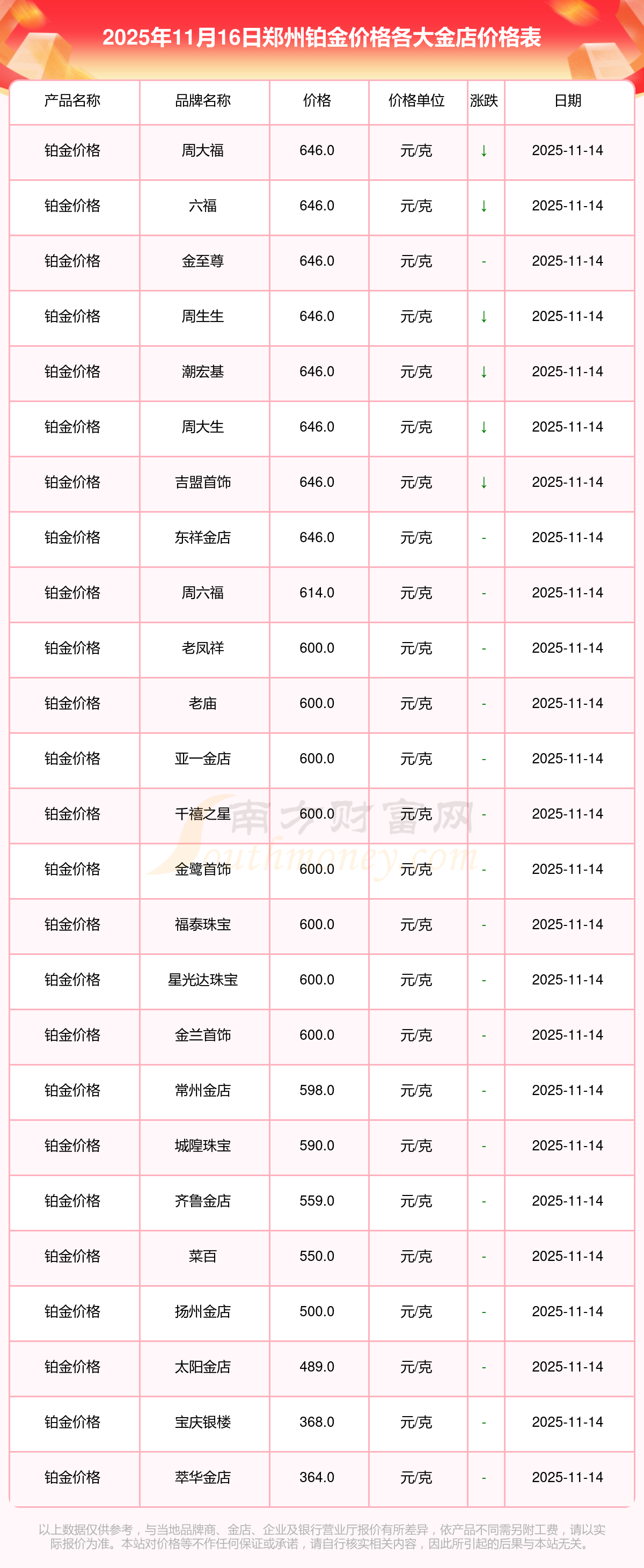 今天是2025年11月16日,鄭州周大福、周大福、周大福、周大福、周大福、周大福、周大福、老鳳祥、老鳳祥、老鳳祥、周六福等各大金店品牌鉑金價格最新價格行情是這樣的:周大福1333.0元/克、周大福646.0元/克、周大福1333.0元/克、周大福46320.0、周大福18410.0、周大福41780.0、周大福1167.0元/克、老鳳祥1322.0元/克、老鳳祥600.0元/克、老鳳祥1322.0元/克、周六福1295.0元/克。