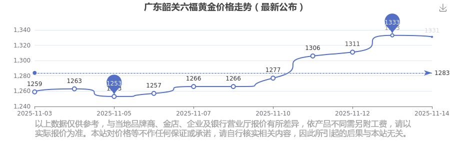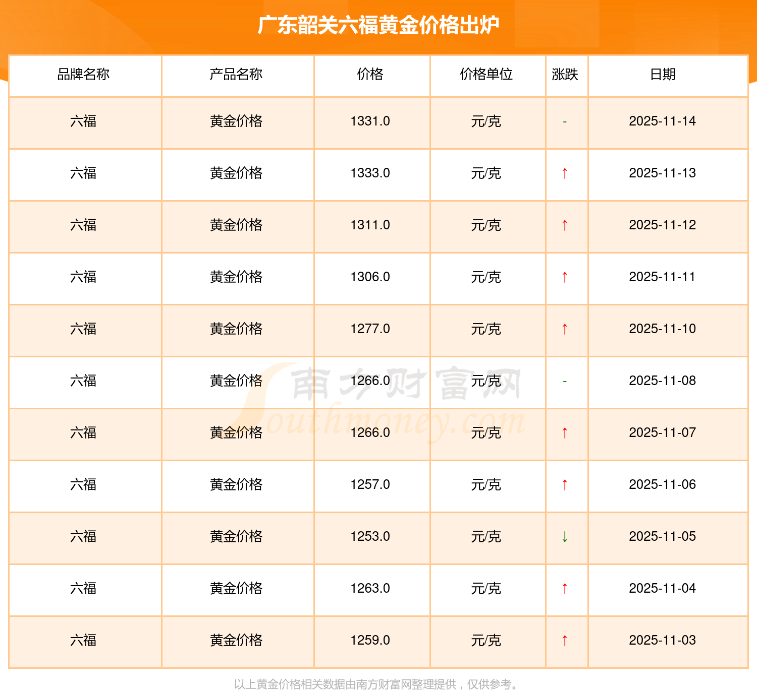 廣東韶關(guān)六福黃金價格現(xiàn)在一克多少錢? 廣東韶關(guān)六福黃金價格表,今日廣東韶關(guān)六福黃金價格查詢,2025年11月16日廣東韶關(guān)六福黃金價格為1331.0元/克。