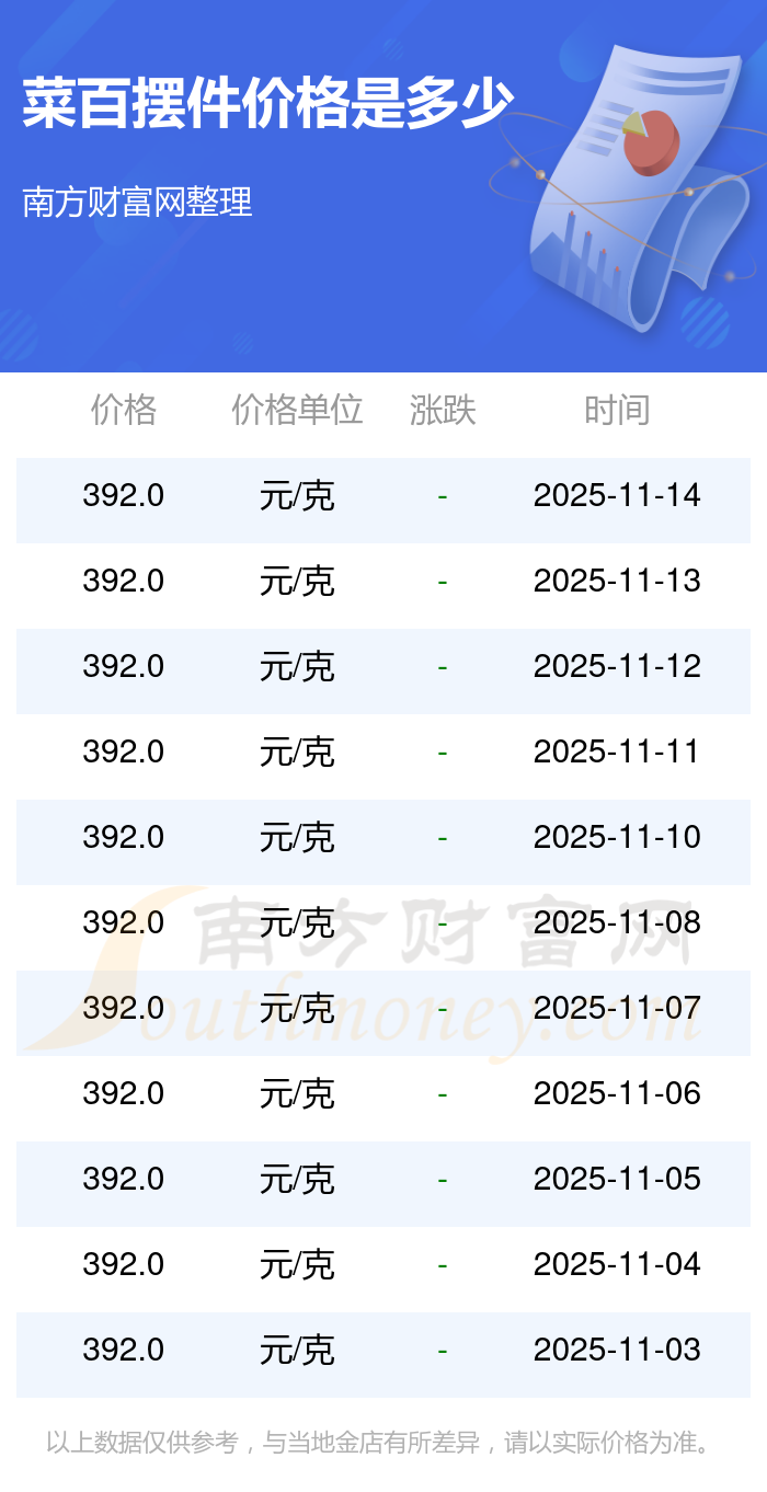 今日(2025年11月16日)菜百擺件價格是392.0元/克。