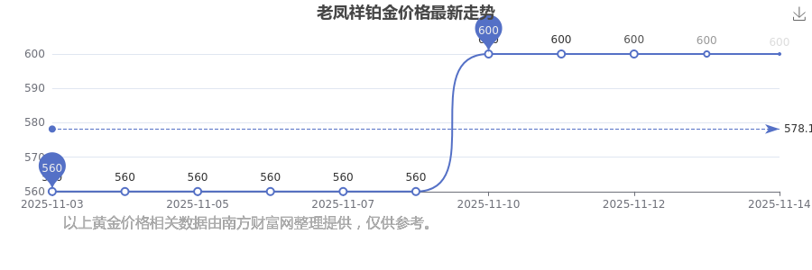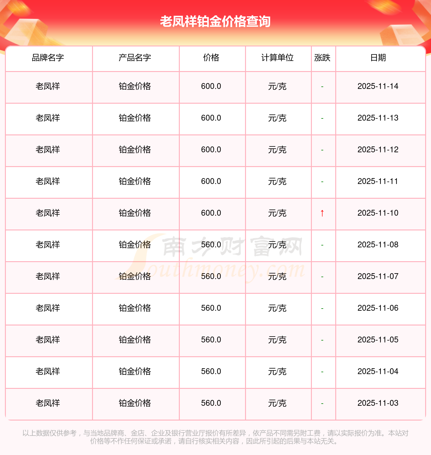 老鳳祥今日鉑金價格的最新標價為600.0元/克。