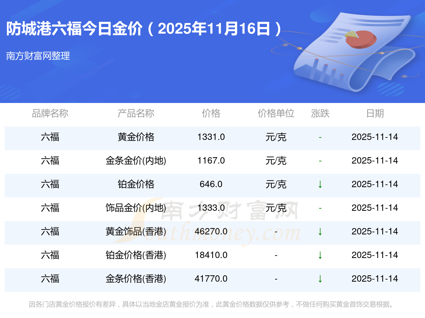2025年11月16日防城港六福最新價格:黃金價格1333.0元/克,鉑金價格646.0元/克,飾品金價(內(nèi)地)1333.0元/克,黃金飾品(香港)46320.0,鉑金價格(香港)18410.0,金條價格(香港)41780.0,金條金價(內(nèi)地)1167.0元/克,黃金價格1322.0元/克,鉑金價格600.0元/克,足金價格1322.0元/克,黃金價格1295.0元/克。
