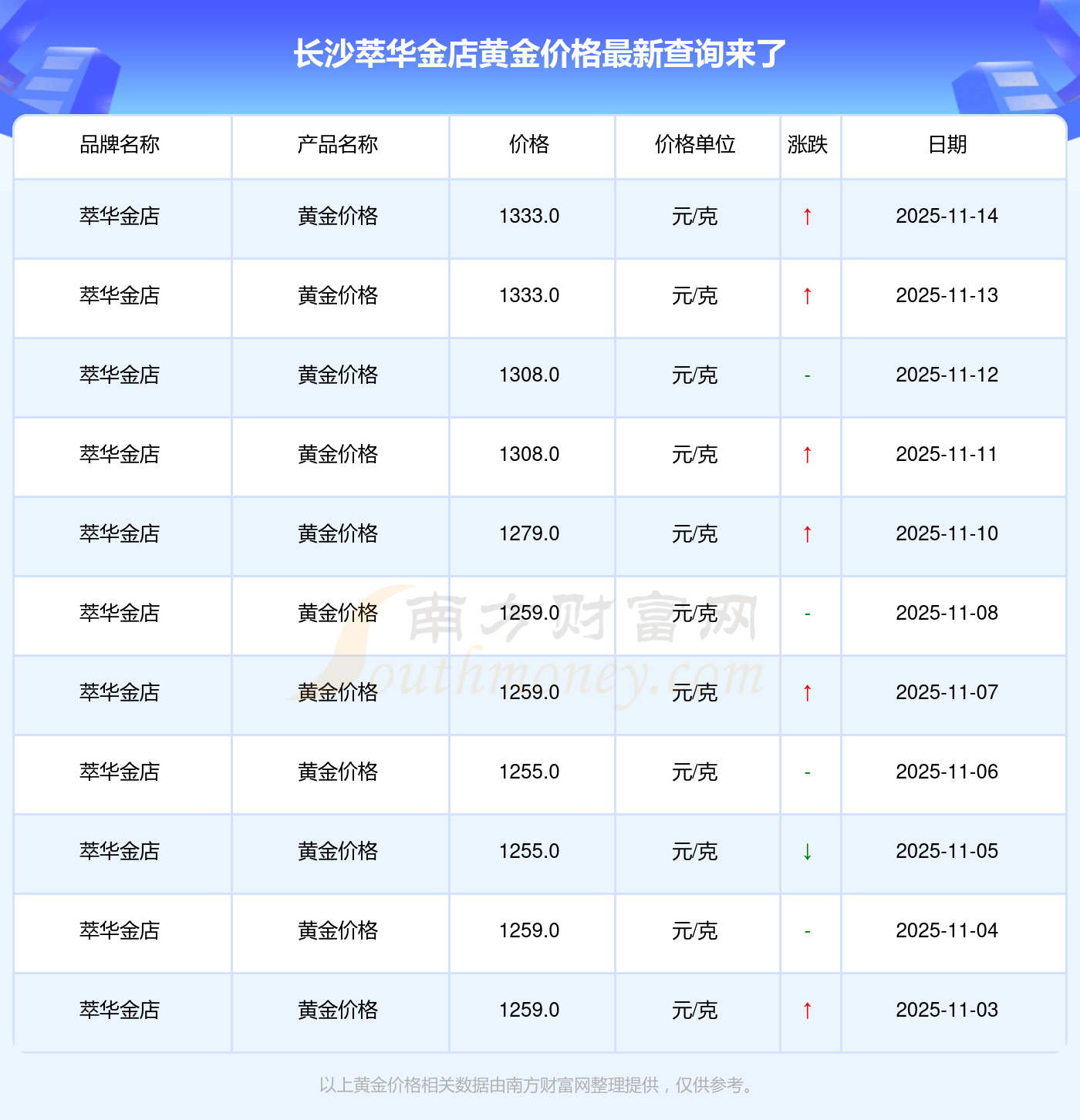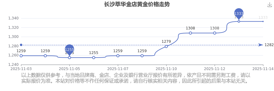 今日2025年11月16日,長沙萃華金店黃金價格為1333.0元/克。