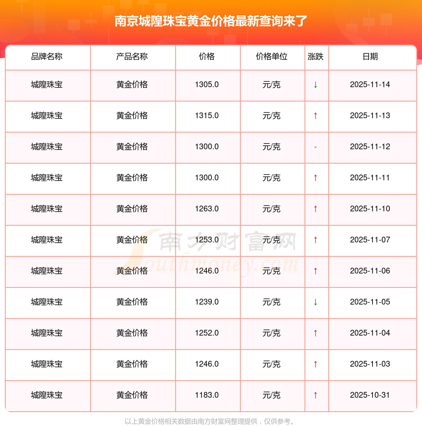 今日南京城隍珠寶黃金價(jià)格公布每克黃金在市面上的價(jià)格是怎樣的2025年11月16日,南京城隍珠寶所售黃金價(jià)格,其價(jià)格設(shè)定為 1305.0元/克。