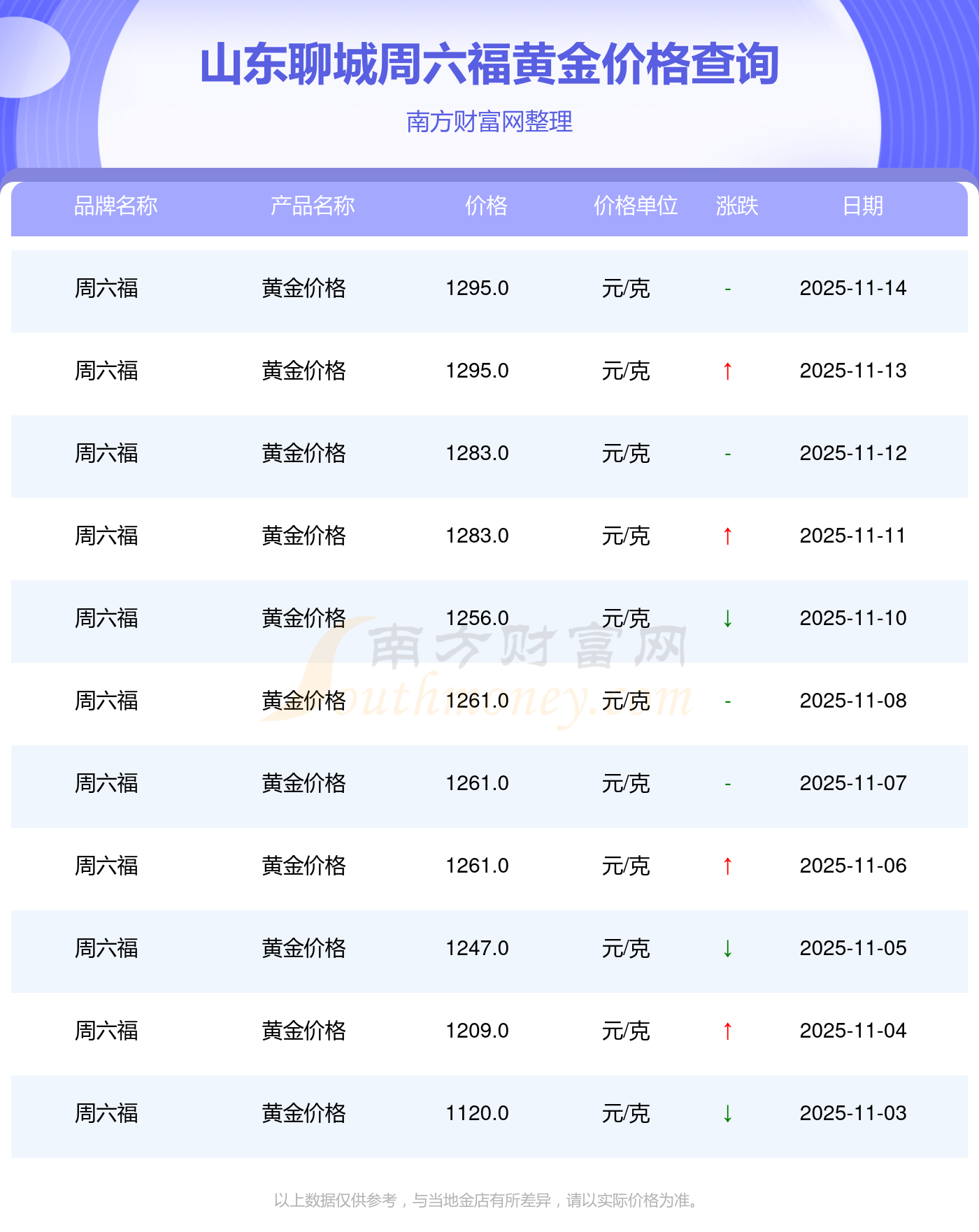 今日(2025年11月16日)山東聊城周六福黃金價(jià)格是1295.0元/克。